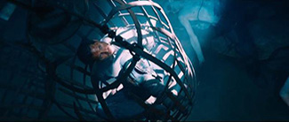 Au-delà de montrer la sauvagerie de l’univers et le trauma du héros, elle évoque surtout le rapport de Max avec ce monde. Au milieu de ses sons de radio et de voix-off, Max lâche la première de ses rares répliques : « les voilà encore qui se frayent un passage dans la matière sombre de mon cerveau« . Max trouve là d’office son statut de loup solitaire luttant envers un passé et un monde qui réclament sa présence. Quelques minutes plus tard, il est capturé et tente d’échapper à ses ravisseurs. La poursuite devient une extension visuelle de cette réplique. Courant le long d’obscurs couloirs, Max est poursuivi par des êtres aussi bestiaux qu’indéfinis et est assailli par des hallucinations renvoyant à ses erreurs passées. Nous ne sommes rien moins que dans le cerveau de Max où il est confronté à ses fantômes et à la réalité du monde de désolation dont il fait inexorablement partie. Tentant vainement d’échapper à cette folie, il trouve une sortie qui n’en est pas une. Les portes s’ouvrent sur un à-pic surplombant de plusieurs centaines de mètres la cité où se jouera son destin. Acculé, il est au final traîné de force dans les ténèbres. Sans rien expliciter de tel, cette première séquence induit ce qui deviendra le choix crucial du dernier acte. Qu’il le veuille ou non, Max et les autres protagonistes font partie de cette société détruite. La seule question est de savoir s’ils accepteront ce glissement vers une lugubre décadence en refoulant leur identité (le pré-générique se clôture sur l’image cauchemardesque d’un Max privé de visage) ou s’ils embraseront cette lumineuse destruction pour en tirer quelque chose de meilleur.