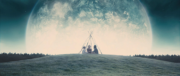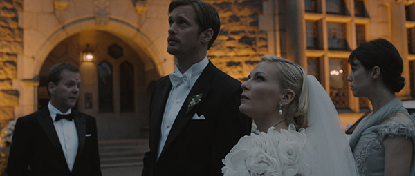 À l’instar des deux hémisphères qui composent notre planète ici menacée de collision frontale, le film se divise en deux parties bien distinctes, chacune étant spécifique à l’une des deux sœurs : à partir de cette fragmentation de récit, le film opère donc une bascule entre deux angoisses précises, celles de la blonde Justine (Kirsten Dunst) et de la brune Claire (Charlotte Gainsbourg). Sous bien des aspects, la première partie évoquerait presque Festen par son contenu et son approche de filmage : la réception et le repas du mariage de Justine dont le déroulement tourne vite au désastre, le tout filmé en caméra portée et exprimé par des gros plans qui captent les émotions les plus diffuses chez les êtres. D’emblée, les tensions s’accumulent : les mariés arrivent en retard à la réception suite à un souci de limousine, Claire et son riche époux (Kiefer Sutherland) expriment leur mécontentement au vu des grosses sommes d’argent investies dans ce mariage, les parents de la mariée (John Hurt et Charlotte Rampling) ne s’aiment plus et font leur numéro sénile chacun dans leur coin, le patron de la mariée (Stellan Skarsgard) offre à celle-ci une promotion sans jamais cesser de la harceler pour récupérer un slogan publicitaire pour sa nouvelle campagne, l’organisateur du mariage (Udo Kier) s’impose en running gag total à force de voir la cérémonie partir en sucette, et même le marié (Alexander Skarsgard) ne comprend plus sa jeune épouse qui se fige trop souvent dans un sourire crispé et une indifférence gênée. Constamment sur le fil du rasoir entre satire sociale et tragédie intime, Lars Von Trier redevient l’espace de quelques scènes cet observateur corrosif des us et coutumes d’une société conformiste, dont la planète Terre, minuscule face à l’immensité de la menace qui se rapproche d’elle, se veut le symbole d’un monde condamné à l’extinction. Mais en associant le spleen à la présence de certains astres, il s’agissait surtout pour lui de capter ce moment où la confrontation au cosmos devient le refuge aux angoisses existentielles rattachées à la terre ferme.