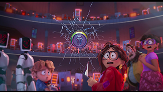 A travers son esthétique globale – on vous recommande également l’interview de Lindsey Olivares, production designer du film – Les Mitchell contre les machines se fait donc l’étendard d’un imaginaire unificateur, indépendant du medium qui le façonne pour peu que chacun fasse un pas vers l’autre. Dans cette logique, l’antagoniste ne pouvait être qu’une IA pragmatique, insensible et rigide, un grand classique de la SF qui sert ici de révélateur au comportement, évidemment individualiste et caricatural, des humains qui l’exploitent quotidiennement. Pas très intéressant dans l’absolu, le personnage est quand même à l’origine de certains des meilleurs gags du film, en particulier lorsque lui et ses sbires s’amusent à imiter les humains, à les faire courser par une bande de Furbys vénères ou lorsque la sacrosainte reconnaissance faciale est court-circuitée par la tronche ahurie de Monchi, le parfait équivalent canin du poulet de Vaiana ! Ou quand le chara-design sert, aussi, à faire avancer le récit.