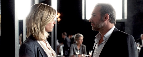 Une fois de plus inspiré par le cinéma américain d’antan et désireux de combiner à nouveau une réelle exigence artistique à une intrigue captivante qui mise tout sur le plaisir du spectateur, le cinéaste décale ici son inspiration du côté du cinéma d’Alfred Hitchcock, en signant une sorte de variation personnelle sur le thème du thriller romantique dont Les Enchaînés reste encore aujourd’hui un maître-étalon. Sur ce point, Möbius déploie une structure narrative brillante à partir d’une trinité riche de promesses : un agent des services secrets russes (Jean Dujardin) engage une tradeuse surdouée (Cécile de France) comme taupe afin de compromettre un homme d’affaires louche (Tim Roth). Trois entités distinctes qui, en se rejoignant, permettent au film d’emprunter des chemins beaucoup plus sinueux, la complexité du propos et des sous-intrigues se renforçant à chaque nouvelle approche du « genre » (comédie, thriller, romance : tout se bouscule et s’entremêle) jusqu’à rendre l’intrigue réellement nébuleuse. Un défaut ? Non, un risque largement payant, d’une part en raison du titre du film (justifié de façon un chouïa didactique dans une scène-clé) qui porte en lui une signification métaphorique de premier choix, d’autre part en raison d’un univers d’espionnage désormais bien connu pour jouer le jeu de la valse des identités jusqu’à plus soif. Par ailleurs, d’une relation amoureuse naissante qui aurait pu faire figure de cheveu sur la soupe (rappelons que la love-story Attal/Kiberlain était pour beaucoup dans les avis négatifs adressés aux Patriotes), Rochant en extrait le double portait de deux êtres enchaînés à leur condition, la duplicité de l’un tardant à se révéler aux yeux de l’autre, chacun jouant potentiellement double jeu jusqu’à l’instant fatal où leurs cartes sont révélées. Ou comment une relation charnelle condamnée d’avance finit par traduire une autre duplicité, plus universelle : au premier plan, des êtres ordinaires qui jouent avec leurs sentiments, et en arrière-plan, des pions manipulés à leur insu par des forces insoupçonnées.