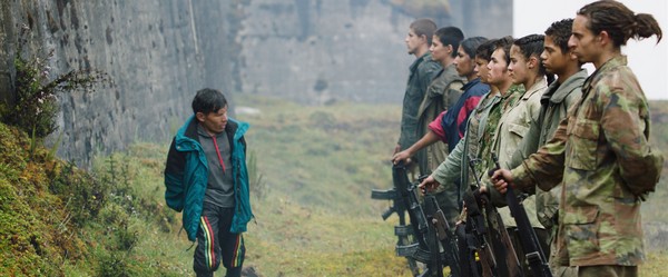 D’entrée, ça fascine parce que ça coince sévère. On est où ? Quand ? Aujourd’hui ou demain ? Qui sont ces silhouettes qui ont l’air de jouer au football au sommet d’une montagne ? Le détail qui tue, c’est qu’ils ont la vue bloquée (leurs yeux sont bandés) et qu’ils doivent faire confiance à leur ouïe pour repérer la position du ballon et ainsi atteindre leur cible. Là, c’est clair, on n’est pas dans un camp de vacances – le lieu est d’ailleurs trop post-apocalyptique pour ça. Et si l’exercice physique semble de rigueur ici, ce serait plutôt du genre militaire : des échauffements survoltés, des luttes pour exacerber le potentiel viril de chacun, et même des fiestas au coin de feu qui virent à la transe chamanique sur fond de fumigène et de crachat de mitraillette. Presque les jeunes paras rebelles et orphelins du récent Jessica Forever qui auraient décidé d’aller plus loin et plus haut dans leur logique guerrière. Voilà donc le tableau : huit enfants soldats, basés dans un bunker isolé sur un plateau de haute montagne colombienne, forment une milice paramilitaire qui s’entraîne pour le compte d’une mystérieuse « Organisation ». Laquelle, par le biais d’un certain « Messager » (un nain bodybuildé qui les mène tous à la baguette), les charge de surveiller une énigmatique doctoresse retenue en otage (Julianne Nicholson) ainsi qu’une vache à lait (nommée Shakira !) prêtée par les paysans du coin. Dans ce cadre tellurique enveloppé par les nuages et évoquant les ruines d’un monde antique, la routine se fait reine. On tourne des vidéos avec l’otage, on se jauge les uns les autres, on s’entraîne à la dure, on joue même à se faire mal – un fouettage de fesses semble être ici un rite forcé pour chaque date d’anniversaire ! Et au loin, on devine qu’une guerre fait rage – la radio s’en fait souvent l’écho – et se rapproche progressivement d’eux. Le jour où le chef désigné du groupe s’estime responsable de la mort de la vache – tuée par un tir accidentel – et finit par se suicider, il n’est plus question d’entraînement, encore moins de jeu, mais bel et bien de repli et de fuite. De la montagne à la jungle, c’est le temps de la descente.