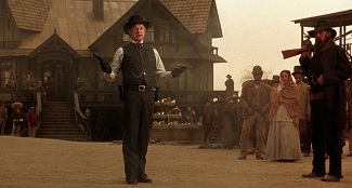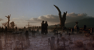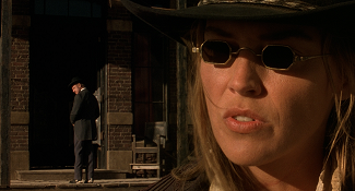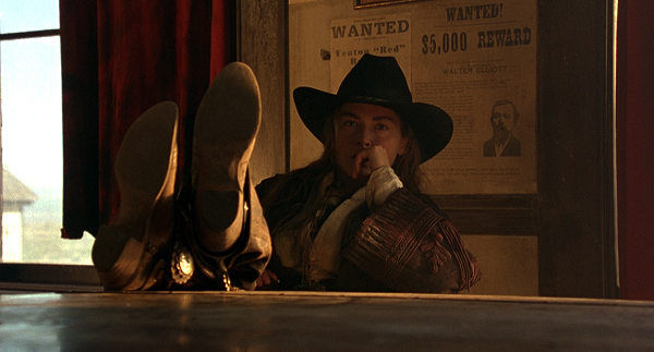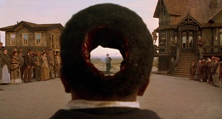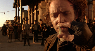 Récemment, avec le psychotrope Double Team de Tsui Hark, on évoquait un prototype de film d’espionnage postmoderne qui condensait et compressait toute la quincaillerie codifiée du genre dans sa scène d’intro pour mieux en réinventer ensuite la grammaire sur un mode… disons… bigarré. C’est un peu l’effet que Mort ou vif procure vis-à-vis du western, à ceci près que la compression des codes du genre s’effectue à l’échelle d’un film entier, tel un baroud d’honneur visant à orchestrer le mariage (mieux : le duel) entre le western spaghetti (celui de Sergio Leone, iconique et maniéré) et du western américain (celui de Sam Peckinpah, brutal et ambivalent). A première vue, tout semble reposer sur une synthèse assumée des figures matricielles du genre. S’y côtoient ainsi des réminiscences de Django, de Winchester 73 (un tournoi entre plusieurs cowboys à la gâchette facile), d’Il était une fois dans l’Ouest (une vengeance motivée par un trauma d’enfance à base de pendaison) et de L’Homme des hautes plaines (un ange exterminateur refait le portrait d’une ville de l’Ouest gangrenée par la corruption). Sans parler de toute la quincaillerie du genre que Raimi duplique et magnifie par un fétichisme hors pair : les matières (le cuir et l’acier), les couleurs (le ciel, le soleil, la terre), les accessoires (revolvers, munitions, holsters, éperons, chaînes, fouets…), les décors (saloon, bordel, hôtel, cimetière, plaines…) et les thématiques (pouvoir, vengeance, rédemption…). L’idée d’inverser le rapport d’échelle entre l’humain et son accessoire (le premier perd ici très souvent l’honneur du close-up au profit du second) ajoute encore à la dimension purement ludique de l’ensemble. Cela dit, vu le panorama ultra-codifié que l’on vient de décrire, où peut-il y avoir du neuf à dégainer ? Question d’angle et de regard, donc d’incarnation et de mise en scène.