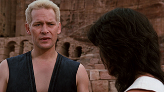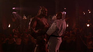 Les joueurs sont donc vite introduits : Liu Kang (Robin Shou), jeune expert en arts martiaux ; Sonya Blade (Bridgette Wilson), policière brutale et très garçon manqué ; Johnny Cage (Linden Ashby), sidekick à lunettes fumées ; sans oublier tout un tas de personnages dont les pouvoirs magiques nous font nous interroger sur les règles d’équité et de déontologie qui entourent un tel tournoi (un banal karatéka qui bombe le torse face à un Sub-Zero qui met une seconde à te transformer en glace pilée : qui va gagner, à votre avis ?). Chacun a ici son petit caractère qui fait mouche ou son petit effet spécial qui séduit la vue. Mention spéciale à un Johnny Cage redéfini en action-star caucasienne et égocentrique qui roule des mécaniques quand il ne se bat pas très mollement (ici, on a davantage visé Michael Dudikoff que JCVD !), ou à un Goro visuellement très classe qui prouve la possibilité de rendre crédible une créature mi-humaine mi-dragon avec quatre bras, même avec un acteur qui joue mal et un budget riquiqui. Le temps d’un voyage sur un vieux vaisseau viking du Parc Astérix à destination de l’île où se déroulera le tournoi, la présence de l’Obi-Wan Kenobi de service est alors révélée au grand jour : ni plus ni moins que Rayden, estampillé dieu du tonnerre avec la coiffure de Jeanne Moreau, et interprété par un Christophe Lambert dont la prestation « habitée », le regard de cocker triste et le rire inimitable (dont il se moque à un moment donné !) valaient à eux seuls le prix du ticket de cinéma.