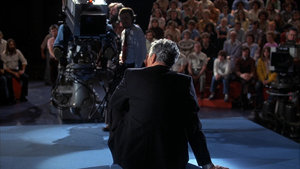 Le scénario diabolique de Paddy Chayefsky, riche d’un sentiment de paranoïa et d’anxiété qui injecte dans les échanges un effet de contradiction bel et bien recherché, met ainsi le doigt sur une actualité toujours brûlante : la quête éperdue du buzz qui fait gonfler la rage irraisonnée et le besoin d’indignation des masses au détriment d’une analyse nuancée, ce que des réseaux sociaux transformés en tribunaux expéditifs et dépourvus de tout jugement mesuré incarnent aujourd’hui au centuple. A l’échelle micro, Lumet et Chayefsky se font donc fort de se servir d’un média pour en accuser un autre, mais à l’échelle macro, Network leur permet de se lancer à eux-mêmes le plus bénéfique des avertissements : vouloir à tout prix propager une idée au public, quand bien même celle-ci revêt les atouts galvanisants du signal d’alerte, est déjà en soi le premier stade d’une dérive risquée vers la propagande et, in fine, vers une folie incontrôlable, vouée à pervertir l’expression de soi et à en payer le prix fort. On entend souvent la même expression à plusieurs reprises dans le film : « Un prophète en colère qui dénonce les hypocrisies ». Forcément, dans cette phrase, le mot « prophète » fait presque plus peur que le mot « hypocrisie ». De quoi nous conforter dans l’idée que Lumet faisait preuve d’une lucidité exemplaire en élaborant une mise en scène aussi épurée, sèche et clinique, pour faire passer son point de vue. Cela dit, quitte à se faire l’avocat du diable, on sera en droit de préférer largement l’option choisie par Oliver Stone sur Tueurs-nés, dont l’infernal maelström de formats d’images et de perspectives déformantes suffisait à créer la nausée vis-à-vis de cette soupe avariée et manipulatrice que nous jettent en pâture les médias.