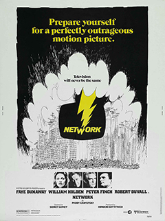 Synopsis : Howard Beale est présentateur du journal télévisé sur UBS depuis quinze ans. Devant une forte baisse d’audience, et malgré les protestations du responsable de l’information Max Schumacher, la chaîne décide de se passer de ses services. Désespéré, Howard Beale annonce son suicide en direct à la télévision. Dès lors, sa côte de popularité explose, et Diana Christensen, responsable de la programmation, lui donne carte blanche pour animer sa propre émission…