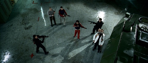 Le plus fort, c’est que Siri évite tous les pièges, à commencer par celui de l’excès de zèle. Sur la description du lent déroulement du braquage ou de l’attaque du fourgon blindé, rien n’est laissé au hasard. Le réalisme est priorisé pour que la suspension d’incrédulité du spectateur ne soit jamais abîmée et la précision du regard de Siri offre d’entrée une parfaite radiographie des détails (décors, tenues, armes, matériels…). Le fétichisme de certains objets est même mis à contribution pour servir de repères narratifs : un violon, une bague, une photo d’enfant, une ampoule clignotante, etc… Ainsi, à force de voir se multiplier les angles d’attaque et de perception, une telle tension a le don de nous clouer au fauteuil sans le moindre effort, grisé autant que tétanisé par une technique de l’élastique aussi virtuose où la déflagration à venir paraît toujours plus inouïe. Une fois que tout le monde est coincé dans l’entrepôt pour la seconde moitié du récit, la règle ne change pas vis-à-vis d’une tension drivée à 100% par une psychologie à la fois pointilleuse et en pointillés. Le film d’action que Siri a su installer pendant une heure – c’est-à-dire une tension qui prépare l’explosion – reste ensuite fidèle à son goût de l’épure et de la topographie, quand bien même les munitions des armes troquent soudain le bruit du chargement pour celui du crachat. Intenses et réglées au millimètre par un cinéaste avant tout éduqué par ses goûts cinéphiles, les scènes d’action laissent bouche bée par leur efficacité, pour le coup à des années-lumière de cette suite de « tirs aux pigeons » qui constituait le point faible d’Assaut. Le stress s’y fait monstrueux, le son s’en retrouve impacté (usage de l’effet de surdité), et surtout, l’entrepôt semble prendre vie à mesure qu’il morfle autant que les personnages (son alarme incendie en fait autant un personnage qui hurle qu’une sorte de navire à la dérive). Siri gère sa montée en puissance comme un maître, et ce jusqu’à un assaut final qui se fait leçon de cinéma en matière de cadres, d’articulations de montage et d’élaboration d’un crescendo avant tout musical (les violons très « herrmanniens » d’Alexandre Desplat orchestrent une gradation parfaite de l’action).