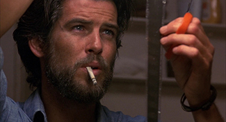 Nomads semble donc dévisser toute logique d’élucidation au profil d’une vraie virée labyrinthique où le sens se construit par l’intuition. Au moins, là-dessus, McTiernan sait nous dérouter. D’un côté, il y a de quoi être sacrément fasciné par sa relecture du nomadisme comme incarnation d’un Mal ancestral et primitif, censé servir de miroir inversé (ou de signal d’alerte ?) à un individu sur le point de s’affilier aux lois et à la normalisation sociale. Une connexion thématique se tisse alors avec le retour au primitivisme qui cimentera le futur Predator, et que Schwarzenegger ait tout fait pour imposer McTiernan aux commandes du film après avoir découvert Nomads tombe sous le sens. De l’autre, on peut s’étonner que cette vision du nomade new look se soit fixée sur l’univers des blousons noirs et pseudo-loubards en cuir : même avec la présence de Mary Woronov (actrice fétiche de Paul Bartel) et du rockeur Adam Ant parmi ces néo-punks, toute incarnation visuelle de la marginalité suinte ici une vieille transpiration 80’s à en filer des palpitations à Jean-Luc Lahaye, donc à rebours de cet esprit rebelle et sauvage qui irriguait la team vampirique d’Aux frontières de l’aube de Kathryn Bigelow. En outre, dans l’idée de créer un héros sérieux dont la désorientation épouserait celle du spectateur, McTiernan n’aura clairement pas été aidé par ce cher Pierce Brosnan. Très longtemps avant d’imiter une chèvre grecque qui chante faux dans Mamma Mia (oui, on n’a jamais pu oublier…), le futur interprète de James Bond révélait déjà de fortes dispositions pour le ridicule involontaire avec un accent français à se cogner la tête contre les murs, le tout épicé de quelques tentatives érotiques maladroites (à quoi bon exhiber son zguègue dans un éclairage ouaté de série rose M6 ?) et d’une poignée de répliques phonétiques qui pissent du culte à chaque syllabe – l’entendre hurler « Ta goule ! » à son épouse vaut à lui seul le déplacement.