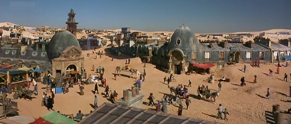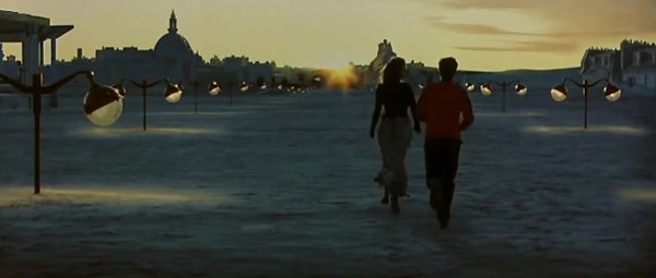 C’est donc au travers d’une fable morale, en aller-retour constant entre le réveillon de l’an 2000 et le Paris de l’an 2070, que se construit Peut-être. Au départ, tout est là pour prendre le pouls de l’espace contemporain. Le générique s’accompagne d’un curieux morceau musical à base d’onomatopées hésitantes qui tentent de faire une phrase avec des sons – parfait raccord avec le titre du film. Les fêtards de l’an 2000 se la jouent futuristes du samedi soir avec un défilé de tenues nonsensiques : dress code Starfleet, macarons de princesse Leia, robe métal à la Paco Rabanne, gel coiffant aluminium, panoplie de robot, squelette de maison hantée… La musique, de Fatboy Slim à Armand van Helden en passant par Martin Circus et Loïk Dury, joue à fond la carte du bordel bruyant. La jeune génération s’exhibe sous les traits de Romain Duris comme une entité flemmarde qui cuisine en mettant trop de beurre dans la casserole, qui boit du vin rouge dans un verre McDonald’s et qui dissimule sa peur de la paternité sous le prétexte d’un monde qui court à sa perte. Et quand le sexe entre à son tour dans la ronde de l’échec, ça fait parfois des dégâts sur la robe et l’esprit d’autrui – no spoiler. Klapisch n’a décidément pas son pareil pour filmer le « tout », pour capturer l’effet de groupe qui se change en mouvement ondulatoire. Mais pour une fois, c’est le « rien » en tant que contraste qui procure un effet bœuf, via ce passage temporel sur plusieurs étages – on passe de lofts toujours plus déserts à un vaste enchevêtrement de jarres géantes – qui amène le héros vers ce Paris de l’an 2070. C’est à croire que le marchand de sable est passé sans prévenir au-dessus de la jungle urbaine : nous voilà catapultés dans un Paname enfoui aux trois quarts sous les dunes de sable, sans rues ni végétation, où tout un chacun s’habille en fripe de souk, circule en chameau-taxi au son des tam-tams, s’envole dans des autogires à la Mad Max 2 et élève une autruche comme animal de compagnie !