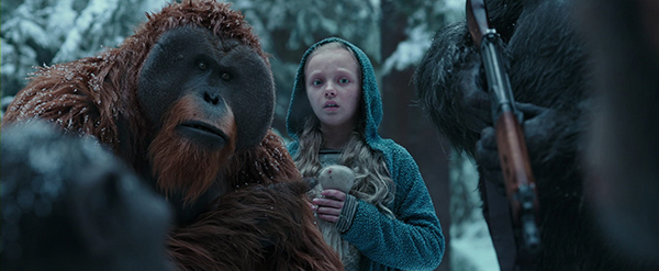 Coupable d’avoir massacré la famille de César, enfermé dans une logique nihiliste depuis que le virus ALZ-113 l’a privé de son propre fils, cet antagoniste acquiert tout d’abord le rôle du vieux sage, prophétisant sans crier gare le futur de la saga : les derniers survivants de l’humanité, laissés à l’état de condamnés sous les effets d’un virus qui les rongent à petit feu, se retrouvent peu à peu privés de leur parole et de leur intelligence (l’humanité muette et sauvage définie par le film de Schaffner n’est plus très loin…). Mais cet antagoniste, en l’état beaucoup plus torturé et complexe qu’il n’en a l’air, visage peinturluré et crâne rasé régnant en maître sur une communauté de soldats en rébellion à l’ordre établi, devient ici l’égal du colonel Kurtz dans Apocalypse Now : d’un côté stade terminal d’une humanité mortifère et génocidaire, de l’autre cible première d’un César qui remonte symboliquement le fleuve du sang pour éliminer le responsable de ses malheurs. Il est certain que la référence au chef-d’œuvre de Coppola reste ici un peu trop appuyée, allant même jusqu’à abuser des attaques d’hélicoptères lors de l’assaut final ou à nous faire lire « Ape-pocalypse Now » sur un mur au cas où on n’aurait pas déjà compris le clin d’œil. Cette maladresse est la seule qui tend à desservir le film. L’effet du « clin d’œil » fonctionne beaucoup mieux lorsque le film s’en sert en vue de faire se boucler la fin de la trilogie avec l’origine de la franchise, et là-dessus, le personnage de la petite fille innocente pèse très lourd : elle est muette et elle s’appelle Nova – libre à vous d’y voir ou non le personnage joué par Linda Harrison dans le film de 1968.