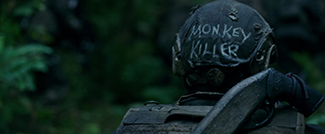 En vrac sont ici cités John Ford, Franklin J. Schaffner, Cecil B. DeMille, Clint Eastwood, David Lean, Sergio Leone et Francis Ford Coppola. On pourrait même rajouter à la liste Stanley Kubrick au vu d’un premier plan très intelligent qui intègre un effet très connu à la Full Metal Jacket dont il reproduit ironiquement le même effet subversif : une inscription « Monkey Killer » sur un casque de bidasse envoyé pour tuer du singe dans une forêt aussi touffue que la jungle du Vietnam, c’est sûr, ça fait effet et sens sur le champ sans avoir besoin d’y caser une ligne de dialogue. De même qu’une autre inscription – plus décalée celle-là – sur un autre casque évoque de façon assez délirante un nanar éponyme des années 50 (Bedtime for Bonzo, réalisé par Frederick De Cordova en 1951) dans lequel Ronald Reagan – pas encore président des Etats-Unis – jouait un professeur pratiquant des expériences secrètes sur des chimpanzés, dont un très gaffeur sur les bords. Le reste, entre un Scope aussi millimétré que chez Leone et de superbes cadres à la David Lean où la spatialisation de l’action frise la perfection, démontre une imprégnation totale du cinéaste par un certain classicisme hollywoodien qui l’a marqué au fer rouge et dont il souhaite reproduire ici le même effet sensitif.