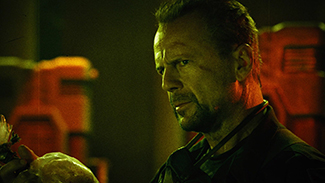 Trop d’ingrédients, brouillés et mélangés dans une intrigue qui tient hélas sur un timbre-poste et qui, par le manque de tenue narrative qui la parcourt, ne produit qu’une sensation d’éparpillement, de bouillie, pour ne pas dire de gâchis. Il y aurait ainsi beaucoup à dire sur la façon dont Rodriguez a visiblement pensé l’identité conceptuelle de son film, ne serait-ce qu’au vu du traitement infligé à l’image. Cette dernière, ici, se veut mutante au premier plan là où Tarantino en avait fait un outil d’émancipation sur tous les plans. Exemple fort : la pellicule devient toujours plus dégueu et détériorée lorsque le film fait de même – voyez la contamination sanguine de Josh Brolin ou le stade final de l’hideuse transformation physique de Bruce Willis. Sauf qu’elle ne vibre pas de l’intérieur pour réactiver ici quelque chose d’éteint. Elle se contente de mourir à petit feu, et ce au prix d’un effet de style qui suscite le dégoût (au mieux) ou la moquerie (au pire). De là à penser que Rodriguez souhaitait que son film soit à l’image des zombies qu’il charcute, il n’y a qu’un pas. Planète Terreur se rêvait sans doute en synthèse vibrante et décomplexée du genre, mais il n’en est finalement que le squelette contaminé, chahuté de l’intérieur par un horrible virus qui le force à pisser du pus et de l’hémoglobine par tous les trous du celluloïd. Et ce virus est très vite identifié : la flemmardise d’un réalisateur dont les aptitudes – déjà très controversées à la base – en montage et en mise en scène atteignent ici un stade critique.