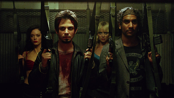 Dans le fond, l’affaire est pliée en une phrase : là où les défauts de fabrication de ses précédents films étaient souvent transcendés par une vraie frénésie rythmique et une quête joyeusement naïve du « plan qui tue », Rodriguez utilise ici les gimmicks de la projection grindhouse comme une excuse déguisée. La mauvaise idée dans toute sa splendeur. Cela rend le film non seulement vain et cynique, mais aussi incohérent vis-à-vis de ce qu’impliquait le projet Grindhouse : ranimer un genre éteint à la vie nécessitait de trouver un flux d’images et d’idées capables d’en détoxifier et d’en réactiver les organes en décomposition. La démarche de Tarantino avait tout d’une révolution là où celle de Rodriguez ne tenait symboliquement que sur une idée visuelle : Rose McGowan en bimbo unijambiste à prothèse-mitrailleuse, sorte de créature proto-Frankenstein reléguée au rang de gimmick promo. Si l’on ajoute à cela le fait que les bouffeurs de chair fraîche n’avaient alors rien de figures tombées en désuétude (même aujourd’hui, on déguste encore de la viande zombie très saignante !), le drame créatif de Planète Terreur achève d’être élucidé. Cela étant dit, l’hilarant trailer de Machete qui précédait son visionnage donnait déjà une idée du gros point fort de Rodriguez : avec un solide sens du burlesque et une vraie déformation parodique des codes du genre, le bougre pouvait encore passer de « petit malin » à « malin » tout court. Et pour le coup, transformer ce petit amuse-gueule en un vrai long-métrage fut sa meilleure lettre d’excuse après un tel ratage.