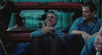 Ce qui séduit d’emblée ici, c’est la qualité du script, l’écriture réjouissante des dialogues. Dès la séquence d’ouverture où le personnage de Matt Damon est félicité pour son travail passé et envoyé vers une nouvelle zone où convaincre les paysans de laisser forer leurs terrains par la compagnie pour laquelle il officie, les échanges ne renferment pas seulement les informations à même de jeter les bases du scénario. Ils ont ce supplément d’authenticité, cette habileté à saupoudrer çà et là quelques éléments apparemment accessoires mais qui éclairent les tempéraments des personnages. C’est grâce à eux que le tandem de démarcheurs nous semblera très vite si proche. Les personnages de Damon et Frances McDormand ont de fait une relation protéiforme dans laquelle interviennent leurs écarts d’âge, d’expérience et de grade professionnel mais aussi leurs longues années de collaboration. Pour autant, le niveau du jeu des acteurs (non maquillés, c’est suffisamment rare pour mériter d’être souligné) et la véracité de leurs conversations préservent les liens entre les protagonistes de toute théorisation. Les personnages paraissent si entiers que leur écriture devient presque « invisible ». C’est là sa grandeur.