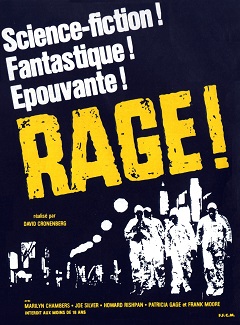 Le système avantageux des tax shelter au Canada n’ayant fait que des heureux – commercialement parlant – suite au succès de Frissons, il était clair que la société Cinépix n’allait pas s’arrêter en si bon chemin. Tourné deux ans plus tard dans les mêmes conditions de production (soit près de Montréal avec un petit budget), Rage forme quasiment un diptyque avec Frissons, aussi bien parce qu’il en reprend les données principales (les bidouilles génétiques, les greffes d’organes ratées, la prolifération d’une maladie sexuellement transmissible, le débordement du refoulé) que parce qu’il en exacerbe la portée initiale. La promesse de la scène finale du film antérieur se voit en effet ici concrétisée, filmant la propagation d’une épidémie à l’échelle d’une ville entière et non plus en la circonscrivant à un lieu clos. Œuvre à la fois suite et jumelle, donc, qui duplique des gènes pour finalement en inverser la nature et la portée. Si le regard subversif de Cronenberg sur la science et la société répond ainsi toujours à l’appel, il opère pour le coup un virage à 180° en donnant chair à un film différent en tous points, peu motivé à l’idée de jouer la carte de la provocation gore, et d’où émerge enfin un élément assez peu mis en avant dans la plupart des analyses de la filmo cronenbergienne : l’empathie. S’il y a bien un reproche que l’on pouvait faire au « cinépsy de Toronto » à ses débuts, ce n’était pas de s’efforcer de faire ses gammes sur chaque film à des fins de perfectionnement (après tout, les progrès se sont toujours fait sentir d’un film à l’autre…) mais de reléguer l’implication émotionnelle du spectateur au rang de joker gadget. La froideur de la mise en scène, la peinture austère d’un monde clinique où l’organique devient révolution, les comédiens réduits à des rats de laboratoire (parce que sujets d’un véritable film-expérience), la prédominance de la matière du virus sur celle de l’humain… Tout cela aura pu peser un peu lourd dans cette réputation de « savant fou » que Cronenberg s’est longtemps trimballé. C’est bel et bien avec Rage que ce schéma binaire prend fin. Cette fois-ci, le cinéaste fait l’effort de se concentrer sur un personnage spécifique, réceptacle d’un terrible désastre, et à partir duquel le film va focaliser toute sa dramaturgie. Non pas parce que l’humain prend enfin le dessus sur le virus, mais parce qu’ici, ironie suprême, l’humain est le virus.