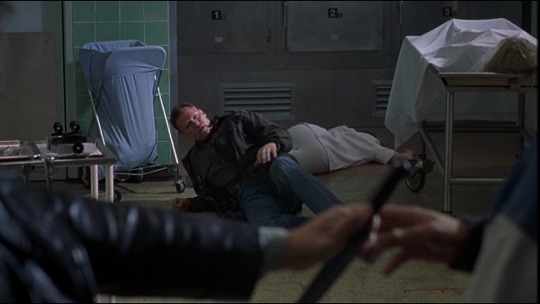Pour Lam, il ne s’agit toutefois pas juste d’offrir un véhicule à la star aussi remarquable se montre-t-elle. L’excellente interprétation de Van Damme se doit d’être au service de la conception qu’il se fait du projet. En acceptant la réalisation, Lam va changer drastiquement la portée initiale de celui-ci. D’abord orienté vers le film d’action façon buddy movie, le cinéaste ramène Replicant à son style propre. Sur Volte/Face, John Woo avait limité les éléments de science-fiction pour tendre vers une surenchère opératique qu’il lui sied plus. Sur un sujet similaire (thématique autour la dualité de l’être dans un contexte faussement futuriste), Lam fait de même en éliminant l’argument comique de l’équation pour revenir vers le polar brut de décoffrage. Il s’approprie le projet et a cette fois-ci l’opportunité d’explorer pleinement le thème du double. A l’inverse de Risque Maximum, ce concept est le moteur même du film et ne peut ainsi pas être minimisé. Lam a tout le loisir d’explorer les mécanismes de son intrigue en montrant comment un flic (l’irremplaçable Michael Rooker) est chargé de retrouver un tueur à l’aide du clone de ce dernier. Le script passionne par le rapport humain qui s’établit entre les deux personnages, le premier étalant sur le second toute sa haine envers l’assassin en le traitant comme un chien. L’argument même de l’intrigue tend vers le subversif. Pour les autorités, le clone est la réplique parfaite du tueur et en conséquence est assujetti aux mêmes pulsions meurtrières. Le seul intérêt des responsables est en conséquence de réveiller le tueur à l’intérieur du clone pour avoir une piste afin d’arrêter l’original. Selon eux, l’individu est conditionné dès le départ et ne peut se construire à travers ses propres actes. Au sein du divertissement, Replicant questionne ainsi régulièrement la notion identitaire entre l’inné et l’acquis. Certains passages sont brillants en ce sens que ce soit lorsque le clone se livre à une variation du « je pense, donc je suis » de Descartes ou lorsque la simple mention d’un patronyme suffit à marquer l’antagonisme entre l’original et sa copie dans le combat final.
