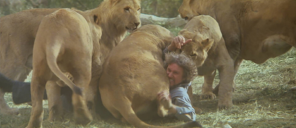 Lorsque Délivrance de John Boorman est sorti en 1972, on pouvait en extraire un constat terrible : la nature n’est pas notre amie. On imagine bien à quel point les rousseauistes ont galéré à digérer leur chou-fleur bio en entendant ça. On imagine mal, en revanche, à quel point l’inconscience régnait à cette époque-là, allant même jusqu’à impacter le 7ème Art lui-même. Le film dont il va être ici question est, à ce titre, un cas d’école hors du commun. Une véritable aberration filmique qui aurait presque pu paraître logique si sa création n’avait été que la conséquence d’un pari perdu ou d’une mauvaise blague. Sauf que non : Roar est un vrai film conçu avec de vraies intentions dans un coin de la tête. Des intentions par ailleurs des plus bienveillantes et utopistes : d’une part, sensibiliser le public sur la préservation des bêtes sauvages en Afrique et les actes de braconnage qui les menacent d’extinction ; d’autre part, exaucer ce rêve d’enfant d’humaniser et de domestiquer la version réelle de ces peluches du Roi Lion que l’on prenait tant de plaisir à câliner dans sa chambre. Bon, certes, en cette année 1969, ce grand cinglé de Noel Marshall n’était pas encore le producteur à succès de L’Exorciste, mais de là à croire qu’il avait encore quatre ans d’âge mental malgré une quarantaine en approche, il ne faudrait pas pousser mémé dans la fosse à hyènes. Toujours est-il que le résultat relève du suicide pur et simple, d’un Maxi Best Of de l’inconscience créative, justifiant du même coup sa réputation de « film le plus dangereux de l’histoire du cinéma », obtenue d’un coup de griffe et sans le moindre effort.