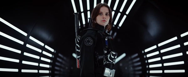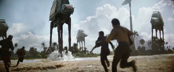 Plus encore, cette problématique de montage paraît influer sur la nature même du spectacle. Il n’est ainsi pas superflu de comparer le style de Gareth Edwards sur ses précédents travaux avec celui de Rogue One. Au premier abord, sa réalisation semble très similaire. D’ailleurs, c’est bien ce qui a pu charmer dans les bandes-annonces. Edwards est un cinéaste qui a un sens de l’ampleur. Dopé par une production design dans la droite lignée de Ralph McQuarrie, il offre des images dantesques de cet univers si connu. Cette qualité passe par des moyens qu’il a déjà employés, soit une action filmée à hauteur d’homme doublée de spectaculaires jeux d’échelle. Sauf que la capacité d’immersion que généraient de nombreuses séquences de Monsters ou Godzilla ne se réitère pas sur Rogue One. L’explication se trouverait précisément dans une gestion du timing très différente. Sur ses deux précédents long-métrages, l’ambiance des scènes les plus impressionnantes reposait sur un rythme posé. Ce côté assez relâché permettait de s’imprégner de toute l’amplitude de ces visions. Or, Rogue One a tendance à saborder cette donnée. Le montage privilégie une dynamique plus soutenue et au bout du compte plus commune. Il est vrai que la comparaison pourrait s’effondrer à cause d’un argument de poids. Les personnages de Monsters et Godzilla étaient des protagonistes relativement passifs car dominés par des forces surpuissantes. Ceux de Rogue One sont des rebelles en lutte, des personnages plus actifs qui appellent logiquement une nouvelle énergie. Toutefois, en écartant ce jeu sur un rapport de force inégalitaire, le montage prive son spectacle d’une dimension intéressante. Celle-ci aurait pu même constituer un moteur émotionnel au regard du sort sous-entendu pour la plupart des personnages.