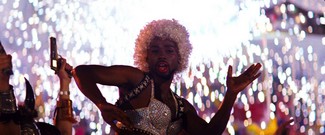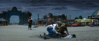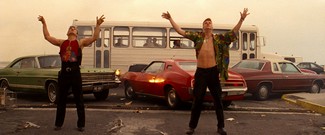 D’un autre côté, Luhrmann se sert du texte shakespearien pour influencer sa propre mise en scène. Exemple : lorsque Benvolio dit à Roméo « Qui vise une belle cible, cousin, la touche vite ! », la réplique prend place durant une partie de billard, ce qui donne un double sens au texte. Cela prouve surtout à quel point le langage devient ici un jeu, une source de stratagèmes visuels et narratifs que d’aucuns ne cessent d’associer aux codes du clip musical à la sauce MTV, déployant de ce fait un style saccadé qui vrille les tonalités et les genres (comédie, drame, action…) dans un tempo relativement succinct. Cela vous choque ? C’est pourtant ce que Shakespeare mettait lui-même en pratique dans ses propres pièces, insistant plus que jamais sur le recours au populaire et à l’amusement pour évoquer le caractère complexe de la condition humaine. Sur ce terrain-là, Luhrmann n’essaie surtout pas de prendre la mesure de quoi que ce soit. Il préfère laisser le verre déborder. Il veut que ça coule de partout. Il veut que ça vibre de toutes parts. Il veut du spectacle, voilà tout. En choisissant d’introduire son décor par un motif théâtral très habile en matière de mise en abyme (l’arc de scène d’un cinéma démoli, situé sur une plage et offrant une vue béante sur le soleil couchant), il met déjà cartes sur table. La suite du show met la gomme : son montage est épileptique, ses images se retrouvent saturées de mille effets (couleurs flashy, ralentis, accélérés…) dans des scènes où la tension ne faiblit jamais, son intro installe un fort échantillonnage par des noms freezés, son art du zoom vise aussi bien les logos des familles que les marques de revolver (tiens, un calibre Beretta 92 est qualifié de « sword » !), ses références cinéphiles se voient comme le nez au milieu de la figure (du close-up sous influence Sergio Leone, des gunfights à la John Woo chorégraphiés et réglés comme des numéros de discothèque), et surtout, son goût du rococo nous met les orbites en boule de billard. Dans cet environnement coule de source le fétichisme du look, des parures, des bijoux, du kitsch baveux, du maquillage outrancier et du travestissement festif qui renvoie à tout un pan de la culture queer. Preuve en est que Mercutio (Harold Perrineau), personnage le plus provocateur de la pièce et secrètement amoureux de Roméo (si si, relisez la pièce !), est ici transformé en drag-queen black ! Bref, le clinquant tapageur dicte ici sa loi sur le cadre, le montage, l’esthétique et la mise en scène, faisant de ce Roméo + Juliette un hallucinant cocktail « rodéo + jaquette ».