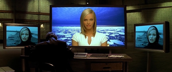 La dynamique du film est ici conçue en deux temps : d’abord les techniques acrobatiques et rocambolesques que Viktor doit employer pour faire croire à l’existence de Simone, ensuite le mur infranchissable qu’il se mange à répétition lorsqu’il s’efforce de dévoiler le subterfuge. Durant la première partie, la règle est simple : chaque ligne de dialogue écrite par Niccol devient une pique bien aiguisée envers tout ce qui entretient l’usine à rêves hollywoodienne : les stars capricieuses, les producteurs soumis aux risques financiers, les publicitaires obsédés par le buzz, les journalistes maxi-fouineurs, les trahisons et les coups bas, la promotion canapé, le voyeurisme d’untel, l’usage de prompteurs, le devenir numérique des acteurs, etc… Un monde dont on ne connait que trop bien le centre de gravité, à savoir ce star-system qui livre en pâture des artistes et/ou des idoles de carton-pâte à l’adoration cannibale des foules et des médias. En cela, Simone est comme un mensonge qui justifie la vérité d’Hollywood : fantasme de tous les réalisateurs, bien sûr, mais surtout définition de l’Art, celui qui imite tellement bien la vie qu’il en devient objet d’adoration névrotique. L’usine du 7ème Art ne se contente pas de cracher du glamour en packaging, elle tend surtout à changer une entité réelle en obsession virtuelle, en chair truquée et remodelée qu’il s’agit de toucher et de percer à tout prix. Et lorsque Simone est « au travail », c’est carrément le niveau supérieur. D’un côté, Viktor concrétise le bidonnage ultime en bernant tous les médias du monde à partir d’un matériel très cheap (un écran, un ordinateur et un logiciel). De l’autre, Simone est moins sa création que sa propre conscience, un miroir à la fois verbal et figuratif, un moyen de s’avouer à lui-même une vérité qu’il refuse d’affronter et de rationaliser autant ses paradoxes que ses propres illusions. Enchaîner les mille et une façons cocasses de rendre Simone tangible (fausses déclarations écrites, interview bidouillée et minutée, lingerie fine éparpillée dans une chambre d’hôtel, usage d’une Barbie ou d’un sosie joué par Rebecca Romijn, etc…), c’est mettre en pratique son talent de cinéaste, sa capacité à donner vie à une illusion. Mais c’est aussi pour lui une énorme prise de risques : celle de passer de Frankenstein à Pygmalion qui serait condamné à devenir Faust.