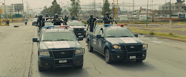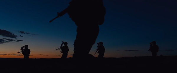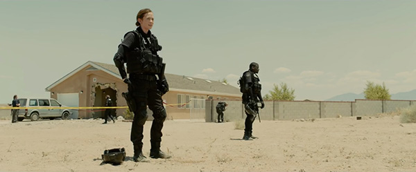 L’intrigue minimale de Sicario, pour le coup proche d’une épure de thriller évoquant la « ligne claire » des plus beaux films de Howard Hawks, permet à Villeneuve d’asseoir ce goût d’une mise en scène millimétrée, précise et immersive en diable, en tout cas riche d’une grammaire filmique qui relève de l’évidence. Et comme toujours avec le bonhomme, il suffit d’un seul plan d’ouverture pour investir un univers et adopter la logique d’un montage atmosphérique, où l’histoire va s’écrire uniquement par les images et le découpage. Dès cette prise d’assaut scotchante d’une maison du cartel par un groupe d’élite, le ton est donné : travellings étudiés à la seconde près, symbolisme cristallin où les militaires deviennent de petits points noirs quadrillant un territoire quasi désertique, conventions du western réactualisées avec malice, violence sèche et sans fioritures, œil d’esthète qui fait de chaque plan une composition visuelle frappante. L’immersion est totale, proche d’un Michael Mann bien que dénuée du même souci d’expérimentation visuelle. Dans cette intro, l’image des flics surarmés aux combinaisons noires est celle qui viendra le plus frapper une rétine déjà bien agitée, et ce n’est pas un hasard. En effet, s’il y a bien quelque chose que l’on sera incapable d’oublier deux heures plus tard, c’est bien cet autre plan, quasi identique, où ces mêmes soldats, cette fois cadrés dans le contre-jour d’un coucher de soleil les confondant physiquement avec le sol obscur, en arrivent à se dissoudre dans l’obscurité, au fil de leur avancée vers la ligne d’horizon. Un plan qui, à lui tout seul, dévoile la richesse symbolique des cadres composés par Villeneuve et pose visuellement les bases de l’ambiguïté sous-jacente du récit.