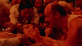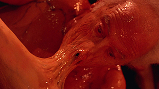 La sexualité définie par Yuzna tout au long de Society ne libère pas. Elle manipule. Elle asservit. Elle piège. Sa pornographie silencieuse se niche ici dans son envers le plus vicieux (le soap-opera flashy où pullule le luxe et l’oisiveté) et suscite illico la terreur chez les non-initiés qui tenteraient de la déterrer. Le corps lui-même n’est plus un organisme autonome, mais une pâte à modeler que l’on pénètre, que l’on malaxe et que l’on mélange avec la chair des autres. De là viendront les visions délirantes et nauséeuses de ce dernier quart d’heure orgiaque, où la tête d’une jeune adolescente sort littéralement du vagin de sa mère, où un père traité de « Face de cul » par son fils se retrouve avec le visage au niveau de l’anus, et où l’on enfonce un bras entier dans le rectum d’un jeune homme pour le faire s’extirper par la bouche ! Yuzna ne cache alors rien de son discours cynique sur une minorité élitiste qui se nourrit de la majorité populo, et choisit de le traduire au sens littéral par une orgie insensée où les corps des dominants et des sacrifiés se tordent, fondent et fusionnent en une délirante partouze de chairs et de matières gluantes. Quant au fait d’avoir choisi un remix de fête foraine du Beau Danube Bleu pour accompagner musicalement ce tableau des horreurs, on mettra ça sur le compte d’une envie d’expédier une grosse tarte à la crème – ou au sperme ! – sur la tête de la bienséance, ce à quoi l’on assiste relevant tout de même d’une très étrange « valse ». Peut-être s’agissait-il au fond d’un écho conscient et décalé avec les voix spectrales qui accompagnaient l’étrange générique de début du film, lequel laissait déjà filtrer un amas de chairs visqueuses et organiques en fusion. Passer de l’abstrait au concret aura nécessité d’en passer par un long simulacre teinté de paranoïa (tout ce que le film propose entre ses deux extrémités), car seule l’horreur tient ici lieu de réalité.