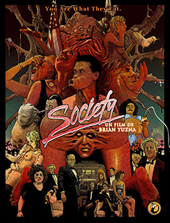 La série Beverly Hills 90210, vous connaissez ? Ses villas californiennes avec piscine, son générique à la BO ultra-90’s, ses couleurs criardes, ses adolescents frimeurs au sourire Colgate, ses voitures de luxe, ses fringues branchées, ses coucheries diverses, ses trahisons, son sida, sa cocaïne, ses armes à feu, et au-dessus de tout cela, la vie de couple et le culte du fric érigés en critères fondamentaux de l’Amérique triomphante… Tout un microcosme soi-disant élaboré en vue de refléter les traumatismes des ados, qui aura pris vie en 1990 sous l’impulsion d’un vieil homme de 67 ans – le mogul Aaron Spelling – qui n’y connaissait sans doute rien. Il ne savait visiblement pas qu’un an plus tôt, un cinéaste d’une quarantaine d’années nommé Brian Yuzna n’était pas dupe de tout ce cirque consensuel. Chez lui, la pomme n’était pas menacée par des vers, mais grouillait déjà de ces créatures visqueuses. Tout tenait dans une interrogation très simple : et si cette haute société américaine prétendument sage et respectable n’était en réalité qu’un simulacre, renfermant un vaste éventail des perversités les plus innommables ? Producteur émérite de deux pellicules horrifiques de très haut niveau signées Stuart Gordon (Re-Animator et From Beyond) et tout juste débarqué du projet Chérie, j’ai rétréci les gosses au profil de Joe Johnston, Yuzna se sera ainsi allié à Woody Keith et Rick Fray – deux scénaristes familiers de la faune de Beverly Hills – pour concevoir l’un des films d’horreur les plus inouïs jamais réalisés. On savait déjà qu’en matière de peinture corrosive et flippante d’une Amérique plus dégénérée que jamais, Society avait atteint un zénith peu commun. Le revoir enfin dans une splendide copie remasterisée sur support Blu-Ray permet de mesurer l’euphémisme.