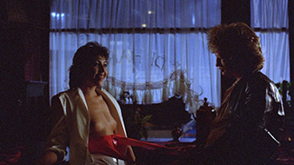 De la même manière, le personnage d’Eef cristallise une large partie de l’ambiguïté du film. On considèrera qu’assimiler cette scène de viol collectif à une acceptation sereine de sa véritable identité sexuelle est erroné, pour ne pas dire franchement répugnant. Verhoeven n’a pas son pareil pour creuser l’ambiguïté d’un personnage à partir des instincts primaires, à savoir le sexe et la violence. Et à ce titre, Eef est un cas d’école : un père illuminé et rigoriste qui le frappe, une incapacité à avoir une érection (« Ta bite est molle comme un spaghetti ! », lui dit celle qui est en train de le branler), un voyeurisme évident à observer la fellation pratiquée par un prostitué sur un inconnu, et surtout un look de John Travolta en décalage par rapport à celui de Rien et Hans. On pense discerner ce qui se passe : le refoulement de son homosexualité est si fort chez lui que seule la violence peut le vaincre. Sauf que le voir supporter un ultime tabassage de la part de son père – à qui il vient de révéler ses penchants sexuels – et entamer au final une liaison avec l’un de ses violeurs – précisément celui qui l’aura poussé à avouer le plaisir qu’il en a tiré – installe une autre hypothèse : la violence de son père l’aurait-elle rendu sadomaso au point qu’il en arrive à apprécier cette violence masculine, quitte à s’y égarer ?