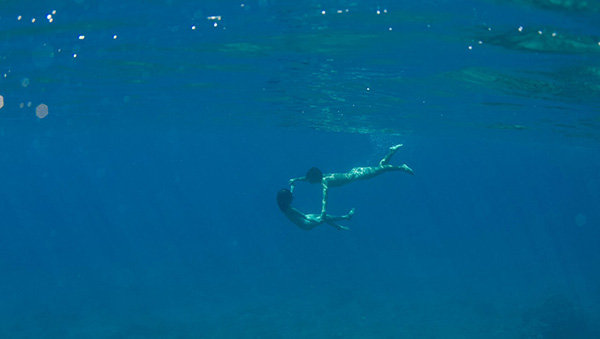 Pour imprégner son récit d’une vraie puissance animiste tout en cherchant la pure élégie formelle, Kawase n’allait évidemment pas calquer sa mise en scène sur celle d’un Malick. Il n’empêche que les visions symboliques qu’elle tire ici de son processus de recherche sont pour le coup inoubliables, en accord parfait avec l’approche sensorielle de l’intrigue et connectées au décor marin. La première de ces visions a d’ailleurs la malice de nous mettre sur une fausse piste : face à la vision inaugurale d’un cadavre flottant au large d’une île, on s’attendrait presque à un polar. Mais bien qu’une enquête soit lancée (avec un tatouage dorsal comme indice satellite), l’hypothèse policière est vite évacuée au bénéfice d’un lien direct avec une hantise inscrite dans l’inconscient collectif. Comme nous sommes au Japon, il y a toujours cette idée de la mort résultant d’un engloutissement de l’archipel, et d’un océan tour à tour calme et violent aux relents de liquide funeste. Sauf que Kawase, toujours par la seule grâce de sa mise en scène, en déroule le contrepoint subtil : la mer devient ici un territoire yin-yang, reflet évident d’une vie en éternel recommencement (plans de vagues qui se brisent sur les rochers) et d’une harmonie des éléments (vision sublime d’une jeune fille nageant toute habillée au-dessus des coraux), en tout cas chargé d’un mystère que les deux jeunes héros vont tenter d’apprivoiser. Si la fille plonge régulièrement dans les flots, le garçon est trop attaché au rivage. Elle veut connaître le plaisir charnel, mais lui esquive à chaque fois. Leur fusion amoureuse sera au final le signe d’un accord parfait, ici illustré au détour d’un ballet sous-marin d’une immense beauté.