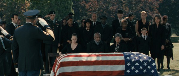On en vient à se demander si le réalisateur ne nous prend pas, dès lors, en otage, en jouant sans trop d’entrave la carte d’un sensationnalisme larmoyant. Certaines scènes sont, parfois, à la limite du trop, même lorsque c’est le très bon Steve Buscemi qui joue les pères de famille incontrôlables. Reste cette opposition frappante, à la fois psychologique et physiquement exprimée, entre les boules de douleur que deviennent les personnages endeuillées, toutes recroquevillées sur elles-mêmes lorsqu’elles n’implorent pas en vain le ciel en levant les bras, et la droiture protocolaire des militaires. Toujours est-il que le film sort de sa première partie forcément répétitive (on suit les visites des deux militaires chez les familles, la formation du jeune Montgomery) sur le mode le plus sobre. La séquence en question, où apparaît le personnage de l’excellente Samantha Morton, est admirable : le spectateur, tout comme les deux hommes, saisit alors que ce sont finalement les réactions les plus retenues qui bouleversent le plus, tout simplement parce qu’elles désarment, qu’elles déstabilisent dans ce qu’elles ont de peu naturel, de contraire à toute spontanéité.