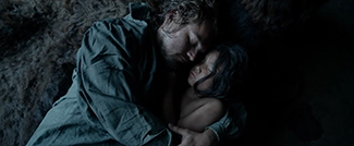 Et quand la vengeance est activée, la folie n’est jamais bien loin. Deux plans vont dans ce sens. D’abord l’apparition rapide (pendant la scène d’ouverture) d’un homme à moitié nu, visiblement hagard, avec un violon dans une main et un pistolet dans l’autre (avec lequel il abat soudain sans raison un cheval). Instant terrible, incongru, absurde, digne d’un Herzog ou d’un Jodorowsky. Ensuite l’arrivée de Glass dans les ruines d’une église où il croit enlacer son fils décédé – ce n’est en réalité qu’un arbre qui a visiblement repoussé au milieu des pierres. Ainsi va The Revenant, expérience inouïe où la nature reprend ses droits sur une humanité revenue à l’état sauvage, multipliant ainsi les visions marquantes : un monticule d’ossements de bisons, une branche d’arbre congelée qui fige ses feuilles dans la glace, un oiseau qui s’extrait de la plaie d’un cadavre (clin d’œil direct à 21 Grammes, dont le titre rattachait le poids de l’âme à celui d’un colibri !), un feu improvisé en pleine forêt dont les étincelles semblent interpeller le ciel étoilé – superbe contre-plongée. Et au milieu de cette nature aussi maléfique que magnifique, il n’y a que des hommes. Capturés dans des contre-plongées ou des vues de profil qui accentuent autant leur présence imposante face à la nature que leur persistance à ne pas se laisser dompter par elle. De par l’effet déformant du grand angle, ils deviennent des massifs minéraux, trahis par une énergie interne qui bouillonne façon cocotte-minute. Ce sont des êtres rudes, égarés dans un décor mental – une nature inhospitalière où la neige et la pluie interviennent à tour de rôle – qui les exhorte à faire ressurgir le meilleur ou le pire d’eux-mêmes pour retrouver la lumière. Ce sont des survivants. Ce sont des revenants.