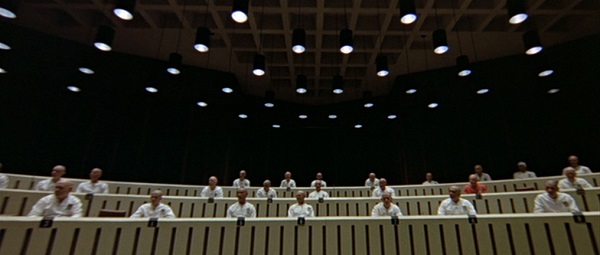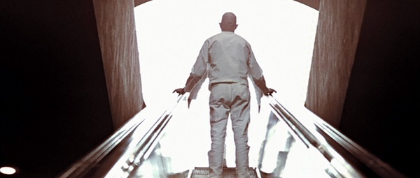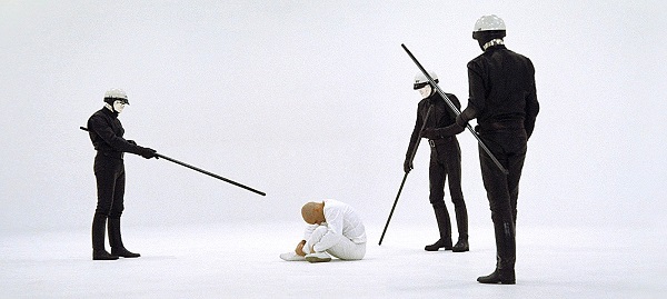 Quel est le monde de THX 1138, sinon déjà celui d’un empire coercitif qui asservit l’humanité ? Au fond, il est très facile de considérer ce scénario non pas comme les prémices thématiques de la saga Star Wars mais plutôt comme la concrétisation dystopique d’une victoire des forces impériales qu’elle mettra bientôt en scène. Si l’on se souvient que le numéro 1138 servira ensuite à nommer un quartier de prisonniers sur l’Etoile de la Mort, ça tombe sous le sens. Les signes avant-coureurs de l’Empire sont donc déjà là. Une fourmilière fermée et monochrome, blindée de lignes de fuite et vidée d’explication sur ce qui a motivé sa création. Une humanité caractérisée par des silhouettes immatriculées (trois lettres et quatre chiffres), au crâne tondu et aux vêtements blancs, qui suivent leur routine quotidienne avec très peu de contacts humains (des cerveaux électroniques servent ici d’interlocuteurs permanents : « What’s wrong ? »). Un pouvoir incarné par une caste invisible à la Big Brother, encourageant l’acte de délation (des fiches postées avec juste le nom du coupable et aucun motif !) et activant l’effet de surveillance et de répression, dont les seuls signes tangibles sont des policiers-robots tantôt violents tantôt défectueux. Une prison d’un blanc immaculé qui semble s’étendre à l’infini, où les détenus sont isolés et maltraités. Une économie absurde qui contraint à l’achat de cuboctaèdres colorés à jeter une fois rentré chez soi – la consommation n’est ici qu’un geste mécanique et vide de sens – et qui développe des crédits limités pour chaque action – on détraque ainsi le système en faisant durer sa propre évasion jusqu’à un surplus budgétaire entraînant l’abandon des poursuites ! Une technologie aussi omniprésente que glaciale – d’innombrables écrans, boutons, claviers et diodes lumineuses dessinent un relief anti-organique à l’image du futur dédale de l’Etoile de la Mort. Des colonnes de lettres et de chiffres qui écrivent la novlangue de cette bulle totalitaire, sans grille de lecture prédéfinie. Et surtout, un conditionnement sous sédatifs et une interdiction des rapports sexuels qui activent à eux seuls le point de bascule du récit : l’arrestation de l’ouvrier THX 1138 (Robert Duvall) pour cause de non-respect de ces deux règles. Double enjeu, donc, dans ce récit à la George Orwell : retrouver l’être aimé et s’enfuir à tout prix de ce monde aliénant.