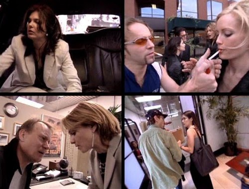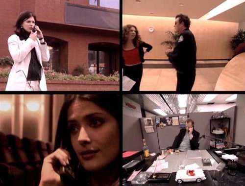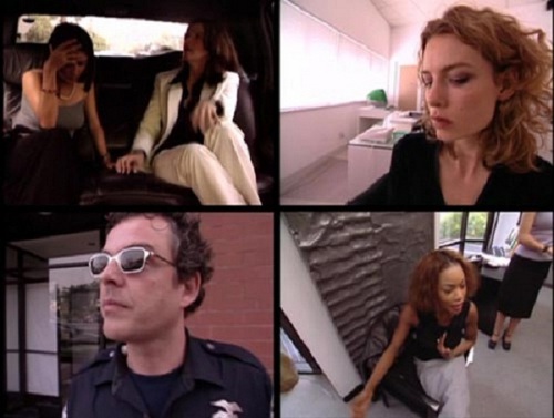Et donc, que se passe-t-il dans ces quatre écrans ? Même si les personnages passent souvent d’un écran à l’autre au fil des plans-séquences, on retient quatre destins spécifiques qui forgent à eux seuls la moelle épinière du récit, qui prend racine dans un petit studio de cinéma. Voici donc Alex (Stellan Skarsgard), producteur réputé, qui sent que sa carrière est en train de s’étioler et tente de noyer son chagrin dans les bras de sa maîtresse pendant une projection-test. Voici aussi Emma (Saffron Burrows), la femme d’Alex, qui sort d’une visite chez la psychiatre où ses problèmes de couple furent abordés, annonce à Alex qu’elle le largue, et erre dans les avenues de Hollywood jusqu’à tomber sur Cherine (Leslie Mann), une amie comédienne. Voici également Rose (Salma Hayek), jeune actrice ambitieuse et maîtresse d’Alex, qui se rend à une audition sensée lui apporter le premier rôle d’un film assez particulier. Voici enfin Lauren (Jeanne Tripplehorn), femme d’affaires coriace et amante jalouse de Rose, qui accompagne celle-ci à son audition tout en soupçonnant son infidélité… Quatre lignes narratives qui se croisent et s’éloignent tour à tour, épicentre d’un vaste récit choral où se croisent une assemblée de producteurs anxieux, un masseur, une actrice, un psy, un flic cocaïné, une cinéaste barrée, un musicien déjanté, et même une série de séismes qui viennent secouer un peu les quatre actions pour mettre tout le monde à l’unisson. Autant dire qu’on tient là un vaste mikado scénaristique dont la cohérence absolue ne tenait qu’à un fil.