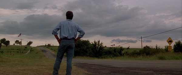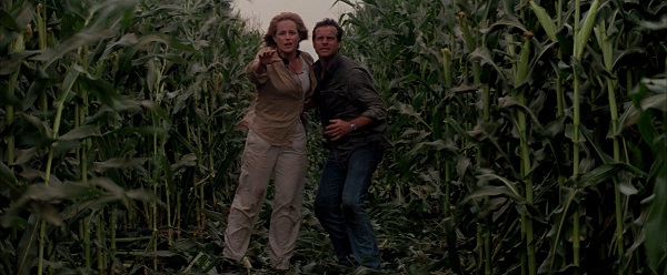 La scène la plus mémorable de Twister inclut un intéressant effet de mise en abyme. Tout commence par un cadre Scope qui, d’un ciel nocturne chargé d’orages et annonçant une possible tempête, est soudain absorbé de bas en haut par l’écran d’un drive-in qui diffuse Shining (on y voit alors la rencontre entre le jeune Danny et les jumelles fantomatiques dans un couloir de l’hôtel Overlook), et tout s’achève par une tornade géante de type F4 qui désintègre le drive-in au moment même où l’on voit Jack Nicholson défoncer la porte de la chambre de son épouse à grands coups de hache. Voir le monument horrifique de Stanley Kubrick intégré dans la diégèse d’un autre film fait désormais sourire (producteur exécutif du film, Spielberg a depuis fait de même dans Ready Player One), mais la tactique élaborée par Jan de Bont (Speed) n’a au fond rien d’incongru. Un phénomène naturel qui installe sa menace en arrière-plan d’une œuvre de cinéma jusqu’à finalement la « dévorer » lors du contact : difficile de ne pas voir là une métaphore du film comme du genre ultra-codifié auquel il se rattache. Ici, point de building qui s’enflamme ou de volcan qui éjacule sa lave, et place à ces gigantesques Moloch ventus que sont les tornades, prêtes à élargir le champ des possibles en matière de chaos propagé. En gros, à force de tourbillonner jusqu’à 300 km/h, elles peuvent déplumer des poulets vivants, transporter des piles d’assiettes sur plusieurs centaines de mètres sans les casser, assécher un lac en à peine quelques minutes, apprendre le roulé-boulé à une habitation, ou faire décoller du sol aussi bien des vaches que des moissonneuses-batteuses. Coupons court au suspense : cette matière destructrice est la raison d’être du spectacle proposé, et le film en fait parfaitement le tour en noircissant une à une toutes les cases à cocher sur sa check-list. Sauf qu’à l’inverse de nombreux fleurons du genre (dont La Tour infernale reste l’Everest insurpassable), l’intérêt de Twister ne tient pas dans le décompte de stars qui cassent leur pipe au fil de la catastrophe, ni même dans cette tendance actuelle qui place l’éthique familiale en épicentre du récit.