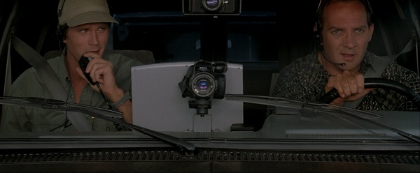 Coécrit par Michael Crichton (vous savez, le gars qui aime les dinosaures…), le scénario démarre les festivités par une scène très impressionnante : traumatisée par ce moment-clé de son enfance où une violente tornade la priva définitivement de son père, Jo Harding (Helen Hunt) prend la tête d’une équipe d’exaltés, vite rejointe par son ex-mari (Bill Paxton), qui sillonnent les routes de l’Oklahoma afin d’étudier ces phénomènes et favoriser la création d’un nouveau système d’alerte. L’enjeu humain qui cimente ce récit somme toute très mince s’avère en tout point identique à celui d’Abyss – deux divorcés qui réapprennent à s’aimer dans la tempête. Les membres de l’équipe sont ici présentés moins comme des candidats sérieux au body-count – ici proche du zéro – que comme des hippies pas très épaissis, caractérisés par des goûts musicaux très bigarrés (on relève un amusant montage musical qui évolue de Deep Purple vers le registre classique) et incarnés par des visages à l’époque plus ou moins inconnus. On y retrouve ainsi une Helen Hunt pas encore oscarisée, un Philip Seymour Hoffman pas encore remarqué chez Paul Thomas Anderson, un Todd Field pas encore réalisateur de Little Children, un Alan Ruck sur le point de devenir l’impayable Stuart Bondek de la série Spin City, mais aussi Jeremy Davies, Joey Slotnick, Zach Grenier, etc… Quant à l’antagoniste météo, il prend une place si importante que son ersatz humain – un Cary Elwes toujours à l’aise dans le rictus de connard – se cale pépère dans une bagnole à l’abri du vent jusqu’à se faire inévitablement souffler le brushing par ce sèche-cheveux géant. A ce stade-là, Twister semble avoir balayé tout effet de surprise d’un revers de la main. Le spectateur sait à quoi s’attendre : il prépare son pop-corn et arme ses cinq sens en vue de savourer les effets secondaires d’un tas de vent destructeur qui viendrait tout balayer sur son passage, que ce soit le suspense scientifique résolu d’avance (les petits capteurs monteront-ils au ciel ?) et les ressorts dramatiques (surtout cette love-story dont on se fiche un peu…). Or, si le plaisir d’un spectacle à l’état pur est constamment au rendez-vous, le film ne peut pas se résumer à cela.
