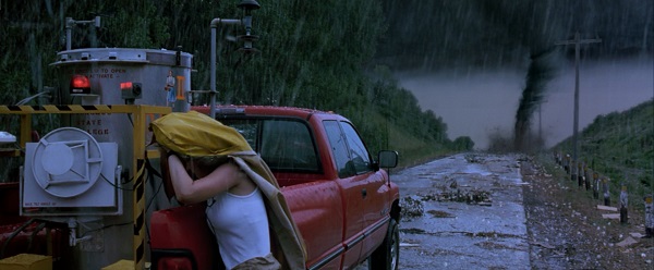 A sa sortie durant l’été 1996, le film de Jan de Bont se calait pile poil sur les rails d’une forte résurgence de la destruction à grande échelle au sein du blockbuster US (Independence Day, Mars Attacks !, Le Pic de Dante, Volcano…), et ce quelques années avant l’heure de gloire de Michael Bay et Jerry Bruckheimer, artisans d’une formule pyrotechnique aussi gratuite que jouissive. Si le genre a toujours été soupçonné – et pas forcément à raison – de refléter les angoisses (les fantasmes ?) de destruction qui animent l’Amérique, Twister est peut-être le seul prototype récent à prendre cette lecture au pied de la lettre. En effet, la tornade n’est pas ici une menace qu’il s’agit de freiner et encore moins de fuir, mais un épicentre autour duquel il faut tourner sans cesse et se rapprocher toujours plus, un peu à la manière des cercles concentriques. Au vu d’une première tornade – celle du traumatisme originel – que la caméra capte en tant que force abstraite au travers d’un hublot, il apparaît clair que le film réactive en quelque sorte la logique morbide de Moby Dick, offrant à Helen Hunt un rôle de simili-Achab chez qui se venger de l’objet de son malheur consiste à s’en rapprocher toujours plus pour mieux réussir à le « transpercer » (il s’agit moins de « tuer » la tornade que d’en percer les secrets). L’éternel combat contre le Mal – ici matérialisé par un nouvel avatar naturel – est donc avant tout une danse avec une obsession, laquelle ne cesse de grossir à chaque nouveau contact. D’où le fait que la narration épouse ouvertement la courbe évolutive de l’échelle de Fujita, montant en crescendo d’un « tube » qui fait s’envoler les vaches (une F2) à ce fameux « doigt de Dieu » qui redessine la topographie locale en terrain vague (une F5). Crescendo qui ne faiblit jamais en intensité et ne singe en aucun cas l’esquive en matière de visualisation des dégâts, surtout quand les éléments s’inversent au cœur de la tempête (pluie horizontale, courant dédoublé, etc…). Ceci ne tient que par le regard aiguisé d’un cinéaste extrêmement exigeant dont le credo favori a toujours été de pomper l’adrénaline de son audience.