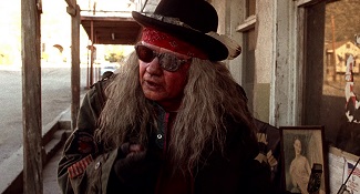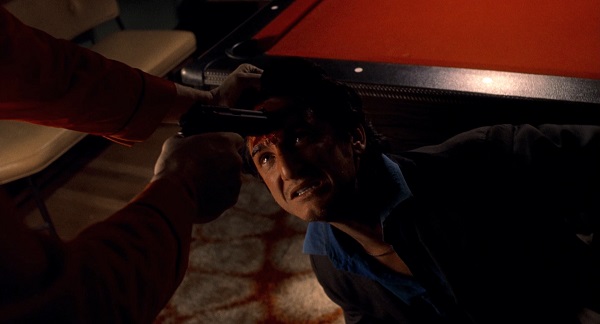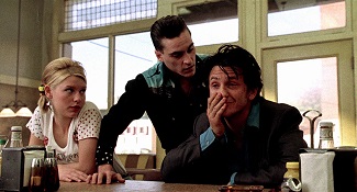 Sans surprise, le cinéaste joue de nouveau les « violeurs de forme » trois ans après Tueurs-nés, imposant un montage hallucinogène, véritable anthologie de la diffraction au sens large, où se déploie une large palette d’effets : jump-cuts, surimpressions, sautes d’images, pellicule surexp(l)osée, décadrages à gogo, montage dans le mouvement, etc… C’est là que le choix du chef opérateur Robert Richardson – futur collaborateur de Quentin Tarantino à partir de Kill Bill – apparaît des plus judicieux. Certes, on ne s’étonnera pas d’investir dès la scène d’ouverture une atmosphère ouvertement baroque, jouant à loisir sur les couleurs vives et l’exagération des teintes pour mieux faire jeu égal avec la caractérisation fiévreuse et quasi cartoonesque des personnages. Mais le film sidère surtout par la texture même de son image, laquelle découle en réalité d’un tournage effectué sur pellicule inversible, qui consiste à placer le négatif original dans la caméra et à l’exposer directement – et non sans risques – à la lumière. D’où cette impression d’une pellicule 35mm qui ne cesse de transpirer et de suer de tous les côtés, créant ainsi une sensation de chaleur bien plus tangible qu’avec n’importe quelle photo cramoisie de Michael Bay. Le film exhale par la même occasion une dimension chamanique qui, pour le coup, ne découle pas seulement de l’image comme cadre symbolique d’une nation noyée dans son propre chaos. Elle provient aussi de la bande-son, en particulier de ce bestiaire musical – notamment des bruits de serpents via l’usage d’un harmonica – que Stone aura réclamé à un Ennio Morricone peu enthousiaste à l’idée de pasticher ses westerns pizza. On sent ainsi un film comme habité par des forces sombres, pour ne pas dire démoniaques, où la noirceur et la monstruosité ne cesse d’être exacerbées, exagérées, poussées à l’extrême de manière à ce que l’effroi violent se change en rire grinçant. D’aucuns auront beau continuer à le juger peu subtil dans sa mise en scène, Stone ne leur tend pas ici la main, bien au contraire. Il donne le bâton pour se faire battre, se joue du grotesque avec gourmandise, fait vriller les codes du genre à chaque détour narratif, adopte la position d’un funambule quitte à chuter dans la trivialité un poil forcée (grande scène de coitus interruptus où Sean Penn se finit derrière un arbre !). Ce qui le rend victorieux tient tout bêtement dans cette rage, dans ce goût du tapissage apocalyptique qui refait le visage du western en lui collant le masque du néo-noir le plus ricanant.