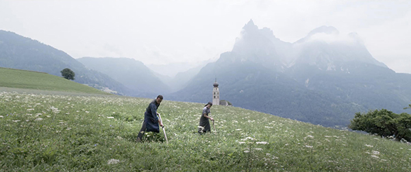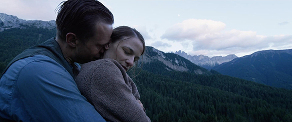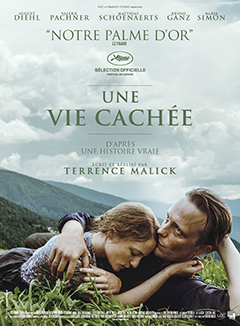 Une douce cascade se jette du haut d’un relief pour atterrir sur la paisible verdure, et c’est tout un raccourci du cycle invariable de la vie qui se voit métaphorisé. Des nuages sombres envahissent le ciel quand ils ne tourbillonnent pas sur le flanc des montagnes, et c’est tout un effet d’annonce de la catastrophe en cours qui surplombe alors les âmes innocentes. Des travaux manuels (faucher, ramasser, couper, planter, cueillir…) sont effectués dans un champ entouré par la majesté originelle des reliefs alpins, et c’est alors une représentation cinématographique de l’éden qui prend soudain chair à travers un cadre et des gestes qui transpirent le concret. Des corps qui s’effleurent, se caressent et s’enlacent au beau milieu des éléments naturels, et c’est la preuve que l’amour, capturé de façon inégalée par un Malick qui le considère aussi vital pour l’âme que ne l’est déjà l’oxygène pour les poumons, est ce qui relie l’être humain à son prochain comme à son espace terrestre. Des visages se retrouvent (dé)cadrés en contre-plongée ou selon une perspective spectrale, et voilà leurs acteurs (magnifiques) métamorphosés en icônes dans un décor brumeux où village et collines renvoient à tout un pan des grands récits mystiques. Entre le plan d’ouverture et le plan de clôture, un espace de terre aura mis trois heures à passer du fauchage de hautes herbes à un champ taillé et cultivé. Symphonie discrète et concrète qui confine en permanence à l’élévation de celui qui y assiste, Une vie cachée se reboucle ainsi sur lui-même, délicat et apaisant par-delà la dureté du monde contradictoire qu’il capte.