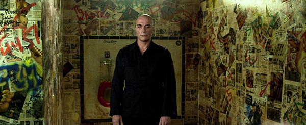 Tout cela est d’autant plus impressionnant que le réalisateur ne se prive pas non plus pour élargir sa palette référentielle dans la moindre scène du film, chacune étant élaborée aussi bien comme un bloc ouvertement maniériste que comme une digression narrative propre aux cinéastes pour qui la règle du « tous les coups sont permis » serait vecteur de liberté créatrice. Du coup, en cherchant à rendre hommage aux grands maîtres du cinéma de genre, le réalisateur ne fait preuve d’aucune frilosité, mixant une poursuite en voiture à la William Friedkin avec des ambiances flippantes tout droit sorties d’un Dario Argento, en passant par un petit clin d’œil assez amusant au Shining de Stanley Kubrick et une séquence de tuerie hardcore dans un bordel inondé de techno, où l’iconisation d’un Dolph Lundgren dégénéré à la sauce Nicolas Winding Refn côtoie des effets de filmage en plan astral et de pulsations stroboscopiques dignes d’un Gaspar Noé. On aurait certes pu craindre que toutes ces références, totalement atypiques dans ce genre de série B destinée aux étagères de vidéoclub, ne soient au final qu’un étalage vain de clins d’œil cinéphiles, voire même un délire ostentatoire de la part d’un cinéaste désireux d’impressionner la galerie en ratissant large. Sauf que les références, digérées avec une impeccable maîtrise sur laquelle bon nombre de jeunes cinéastes devraient prendre exemple, servent complètement le récit tout en offrant à celui-ci une réelle hétérogénéité. A ce titre, dans le dernier acte qui verra le héros remonter une rivière en bateau avant de se confronter à sa propre Némésis, à savoir un Luc Devereaux devenu le chef d’une secte d’UniSols en guerre contre le gouvernement, l’audace du cinéaste à inscrire son film dans la droite lignée d’Apocalypse Now n’est en rien un signe de folie des grandeurs. D’abord parce que cette quête identitaire trouve alors une chute si percutante qu’elle peut facilement se définir comme une vraie marche funèbre (celle d’un être découvrant in fine que sa vie et ses souvenirs n’était qu’un simulacre), ensuite parce que la découverte d’un Jean-Claude Van Damme en dérivé du colonel Kurtz maquillé façon yin-yang dans une grotte où se terrent les « rebuts » du gouvernement américain renvoie Luc Devereaux au rang de créature de Frankenstein retournant la violence contre ses créateurs, enfin parce que le parcours du héros synthétise la quête d’un authentique « répliquant » sans histoire ni passé, contrôlé par des souvenirs auxquels il s’accroche coûte qui coûte, même si ceux-ci ne sont qu’un leurre fabriqué de toutes pièces.