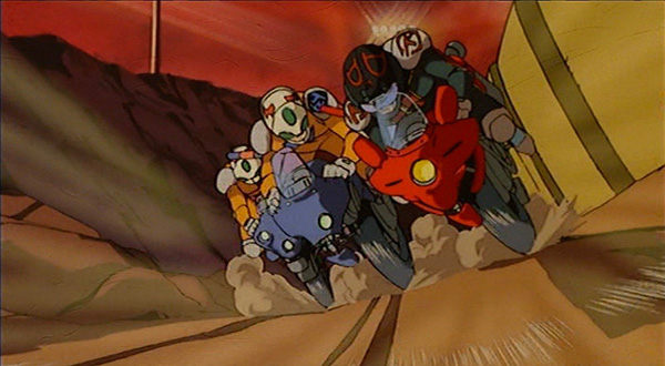 Si la description de Susan d’un rêve qui a pourri fonctionne, c’est le design l’accompagnant qui va permettre de frapper les esprits. Au-delà d’être une terre désertique aucunement agréable, Venus donne surtout l’impression d’avoir vu son développement stoppé en cours de route. L’environnement tient de l’industrialisation répondant aux besoins les plus basiques. Aucun confort ne transpire des images et une ambiance de précarité domine. On ne sent ainsi jamais que la population est censée s’installer de manière définitive. Le désordre règne dans chaque coin de cadre comme si les protagonistes étaient sur le point d’arriver ou de partir. Bref, on baigne en pleine apathie. C’est ce qui ressort des courses de moto constituant la principale source de distraction sur Venus. La compétition y a moins d’importance que les démonstrations de violence pimentant un peu un quotidien morose. C’est à ce sport que le personnage principal Hiro et ses compagnons consacrent leurs temps, quand bien même leur entraîneur leur dit ouvertement qu’ils ne sont pas très doués. Comme pour ses spectateurs, Hiro a l’air de vouloir tromper son ennui et former un groupe solidaire en l’absence d’autres éventualités d’avenir.