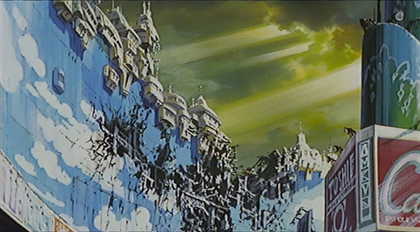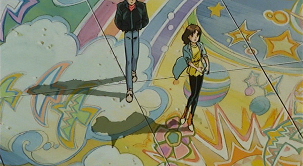 Tout ce statu quo est chamboulé lorsque la guerre est déclarée. Une invasion brusque intervenant sans crier gare à la fin de l’exposition… et qui se terminera tout aussi rapidement. Passé l’assaut initial, la vie reprend son cours sous l’occupation. Le changement de pouvoir ne semble rien impliquer dans un monde si amorphe. Venus Wars en tire là sa scène-clé. Dans un centre commercial, Maggy, l’amie de Hiro, déclare vouloir voir la vie du bon côté et que certaines choses demeurent en dépit de la guerre. Le personnage est alors cadré en plongée dévoilant une fresque colorée sur le sol. Hiro ne partage pas cet optimisme. S’en suit un plan en contre-plongée sur une peinture de ciel bleu à moitié détruite et une série de plan montrant les différents impacts de la guerre. Baisser la tête et laisser courir ou constater la réalité pour ce qu’elle est et y faire face, tel est le choix s’imposant aux protagonistes. Un peu plus tard, Hiro révélera l’origine de son caractère désabusé. Avec sa famille, il est venu sur Venus pour s’installer dans une colonie fermière. Or le projet était voué à l’échec, aucune culture n’arrivant à prendre. Tout n’a été monté que pour des raisons politiques et médiatiques. Hiro en est venu à rejeter toute forme d’institution qu’elle concerne le gouvernement ou la rébellion.