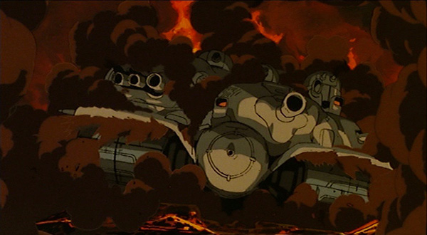 Car quand il choisit de jouer à l’insurrection, c’est en attaquant le tank stationné près de son ancien circuit de course. Sans tomber dans la pure vengeance, son acte tient avant tout d’une contestation envers le vol du le peu de bonheur dont il jouissait. Ainsi n’accorde-t-il pas plus confiance à une institution officielle qu’au commandement des rebelles, pensant que ce dernier veut l’instrumentaliser au profit de son combat. Ce qui est effectivement le cas malgré un fond de respect mutuel. Plutôt que de scander ses propos alarmistes, Venus Wars se structure autour du parcours émotionnel de ses personnages et le besoin d’agir en accord avec soi. C’est d’ailleurs ce sentiment d’immersion qui se dégage du brillant travail d’animation. Pour bien nous plonger dans l’univers, le film veut créer une sensation de pris sur le vif. Cela tient évidemment du paradoxe dans un domaine artistique où tout créé de A à Z. C’est là où ressort l’intelligence de la mise en scène de Yoshikazu Yasuhiko. La mise en valeur de l’animation et de la masse de travail qu’elle a réclamé n’est pas forcément à ses yeux une priorité. S’il veut retranscrire la rudesse de son monde, alors il doit le montrer en tant que tel. De ce fait, il n’hésite pas à recourir aux gros plans plongeant au cœur de l’action et à composer des cadres peinant à la saisir. Combiné à la nervosité et vélocité de l’animation, le résultat devient sidérant pour nous faire vivre au plus près le moment. Chaque élément laisse ainsi transparaître sa dureté et son poids, ce qui s’avère primordial pour l’illustration de la guerre. Celle-ci apparaît presque déshumanisé, mettant très peu en avant les troupes. Ce sont plutôt les tanks et autres méchas qui tiennent le devant de la scène. Cette absence de visage humain est d’autant plus forte que l’animation nous signifie constamment la puissance de ces engins sans âme. Ce qui ne fait que rejoindre le discours du général en charge de l’occupation. La guerre devient une sorte d’état d’esprit immuable qui dépasse le seul individu et le déresponsabilise.
