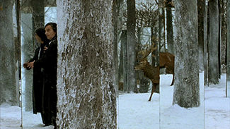Pour autant, on l’aura bien compris : nous sommes ici dans un univers de pure chorégraphie, où l’alchimie entre les visages et les corps devient geste artistique et gage de sublimation esthétique. En cela, Visage se compose donc de plusieurs tableaux où se croisent les mythes et les symboles, avec, en filigrane, la présence fantomatique du musée du Louvre comme terreau de la culture. En guise de pot-pourri esthétisant, on aura droit à une Laetitia Casta qui danse le tango face à un cerf dans une clairière enneigée, à un Mathieu Amalric qui s’offre une fellation dans un buisson pendant un quart d’heure en plan fixe, à une Fanny Ardant qui cherche sa chaussure paumée dans un décor inondé de neige artificielle, à un Jean-Pierre Léaud qui enterre un piaf mort à côté d’une sépulture en écoutant de la techno pourrie, à deux femmes qui remplissent et vident à tour de rôle un frigo surchargé pendant un dégivrage, à une scène atrocement intenable où Casta (encore elle !) recouvre une fenêtre de petits morceaux de scotch noir pour empêcher la lumière de rentrer, et, comble du portnawak, à un final involontairement hilarant où Casta (toujours elle !) joue les effeuilleuses érotico-sensuelles dans l’entrepôt frigorifique d’une boucherie tout en recouvrant son amant de sauce tomate ! Et ne parlons même pas de cette séquence sans queue ni tête où trois actrices vieillissantes (Ardant, Moreau et Baye), seules à une table où devait visiblement avoir lieu un dîner, trompent leur ennui (pas le nôtre !) en ne faisant rien du tout…