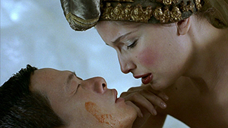 Gage involontaire de cette maladresse, Tsaï aura au moins su révéler la muséification de la Nouvelle Vague, entreprise tellement porteuse d’avenir à l’époque qu’elle en est arrivée à se renfermer sur elle-même, au point de devenir quelque chose de terne et de mortifère, perdu au beau milieu d’un musée vide et poussiéreux. Cet état des lieux, drôle et tragique à la fois, constitue assez clairement le seul intérêt cinéphilique de Visage et évacue ainsi toute la portée symbolique de cette « intrigue » basée sur le mythe de Salomé, dont la seule caractéristique se résume vite à des chorégraphies assez belles mais totalement vaines, et à une avalanche de look vestimentaires dignes d’une publicité pour Christian Lacroix (coup de bol, c’est lui qui fait les costumes !). Pour autant, malgré une avalanche de casseroles artistiques accrochées au derrière et une sélection cannoise qui apparait de plus en plus comme une énigme insondable, Visage réussit tout de même à éviter le zéro de justesse. Deux raisons à cela : d’une part, aussi pesantes et interminables soient-elles, les séquences élaborées par Tsaï dégagent un vrai sens de la picturalité (preuve qu’il y a un vrai artiste derrière la caméra), et d’autre part, nul doute qu’avec un taux important de THC dans le sang, les gesticulations nonsensiques de la belle Laetitia Casta auront de quoi provoquer de jolis fous rires entre deux longues plages d’ennui. Résultat des courses : pour la pose auteuriste sans queue ni tête, c’est du super, mais pour l’expression esthétique et réflexive, c’est du sans plomb.