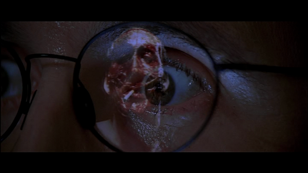 Volte/Face brille ainsi par la densité et la complexité de son jeu d’antagonisme. Woo a régulièrement mis en scène au cours de sa carrière des ennemis jurés, des personnages exaltant leur obsession de détruire l’adversaire. Avec ce long-métrage, on semble arriver au bout de cette thématique tant elle atteint des sommets indescriptibles. Le réalisateur saisit ainsi l’extrême ambiguïté d’un tel thème à travers son principe de changement identitaire. Schématiquement, l’un devient l’autre afin de l’éliminer. Par ce biais, le film questionne la frontière entre le bien et le mal en rappelant l’extrême proximité de ses deux notions chez les individus (généralement cette similitude est la cause même du conflit). Toutefois, Volte/Face va plus loin et inscrit un autre niveau de lecture par rapport à l’idée du transfert d’identité. Car finalement, l’un devient l’autre surtout pour se détruire lui-même. D’ailleurs, ça pourrait être le sens véhiculé par la séquence la plus culte du film. Dos à dos contre un miroir, les deux ennemis discutent afin de savoir s’ils trouveront un terrain d’entente afin de récupérer leur vie précédente. Voyant rapidement qu’ils n’arriveront à aucun compromis, ils décident de s’entretuer. Ils se retournent face au miroir derrière lequel se trouve l’antagoniste et font feu. Bien sûr à ce stade de l’histoire, le miroir renvoie désormais à chacun le visage de la bête à abattre et c’est avec un soin pervers qu’ils visent ce détestable reflet. Néanmoins la scène est plus complexe que la simple mise en avant d’une image graphique forte. Car un miroir ne renvoie pas uniquement une apparence. Symboliquement, le miroir permet une divulgation de l’âme ou du moi profond de l’être qui y fait face. En tirant, les protagonistes ne brisent pas juste le visage de l’opposant mais également leur identité propre.