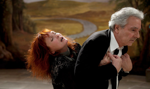 Il y a toujours eu beaucoup de théâtre chez ce « pur cinéaste » qu’est Resnais, de ceux qui travaillent la forme, la malmènent pour ménager de nouvelles possibilités pour leur art : L’Année dernière à Marienbad (1961) en insérait dans le grand rêve du personnage, Mélo (1986) était adapté d’Henri Bernstein tandis que Smoking / No smoking (1993) et Cœurs l’étaient d’Alan Ayckbourn. Voilà qu’il choisit d’adapter, en enchâssant l’une dans l’autre leurs intrigues respectives, deux des pièces de Jean Anouilh où il est question, précisément, de théâtre : « Eurydice » (1941) et « Cher Antoine ou l’Amour raté » (1969). Premier niveau de complexité apparente que ces mises en abyme. Le merveilleux, la fantaisie, on les retrouve eux aussi : dans l’artificialité assumée de ce cliché d’automne venteux dans lequel les treize personnages endeuillés arrivent dans le manoir mégalo d’Antoine ; ou dans les libertés que prend le cinéaste dans sa narration et sa mise en scène. Les treize invités se voient demander par Antoine, en guise de dernière volonté, de juger le travail d’une jeune troupe sur la pièce du dramaturge qu’ils ont eux-mêmes jouée par le passé, à des époques différentes : « Eurydice ». Très vite émus, assis sur leurs canapés face un grand écran, ils se mettent à rejouer le texte puis à se remémorer ces mises en scène passées dans des sortes de visions rêveuses. A mesure que ses personnages se laissent ainsi transportés, Resnais se cache de moins en moins d’ignorer toute continuité autre que celle du texte : dans des « faux raccords » délibérés, les personnages changent subitement de canapé, se rapprochant de leur partenaire d’antan, ou voient le décor qui les entoure évoluer progressivement pour correspondre aux impératifs du texte. L’expérience est ludique, avant de se révéler répétitive voire pesante : les allées et venues sont incessantes entre trois groupes d’acteurs qui incarnent chacun cette même pièce, les stylisations spatiales et narratives (écrans divisés) virent à l’ostentation vaine voire au lourdingue. Si tant est qu’il ne se limite pas qu’à l’exaltation de sa propre nature, quel « vrai » cet artificiel, ce « faux » est-il supposé révéler ? Peut-être bien des questions intimes, que Resnais se pose plus que jamais à 88 ans : qu’est-ce qu’aimer ? comment aimer quelqu’un qui n’est pas vierge, que l’on doit prendre avec son passé ? qu’est-ce qu’aimer un acteur ou une actrice quand on est metteur en scène ? l’acteur est-il capable de dire la vérité ? qu’est-ce que la vérité ?