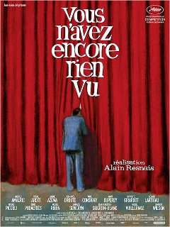 Ce qui frappe en premier lorsque débute Vous n’avez encore rien vu, c’est l’attention portée au visuel et le goût d’emblée affiché pour la stylisation. L’excellent chef opérateur Eric Gautier, entre deux films pour Desplechin, Assayas ou Walter Salles dont il est également un collaborateur fidèle, a imprimé au cinéma d’Alain Resnais un aspect très léché, une image comme légèrement floutée par un voile délicat qui donnait déjà à Cœurs (2006) et aux Herbes folles (2009) leurs airs de rêves éveillés. Ce qu’il faut bien appeler une atmosphère visuelle enveloppe déjà les interprètes du film lorsque ceux-ci, presque tous dans leur propre rôle, reçoivent en cascade le même coup de téléphone leur annonçant la mort d’un ami commun, le metteur en scène Antoine D’Anthac (Denis Podalydès). La stylisation donc, ne tient à ce stade qu’à cette forme certes originale mais répétitive et un brin assommante de générique où, plutôt que d’être écrits, les noms des treize comédiens sont prononcés au bout de la ligne du téléphone par le majordome du défunt (Andrzej Seweryn). Est-ce là qu’elle se manifeste, la soi-disant jeunesse éternelle de Resnais, désormais nonagénaire, dont trop de critiques osent faire leur argument maître pour défendre son cinéma ? Le goût de la farce (rappelez-vous la fin absurde des Herbes folles, destinée uniquement à donner aux critiques « quelque chose à ronger » selon Mathieu Amalric, cf. l’interview dans Positif n°615) et de la stylisation est manifeste, mais atteste-t-il pour autant d’une fraîcheur ? Au vu de l’impression de ressassement que donne ce nouvel opus, on répondra par la négative. La chose est d’autant plus regrettable que la volonté un peu bravache de réserver des surprises, affichée dès le titre, ne débouche sur rien ou presque : Vous n’avez encore rien vu peut même avoir des airs de balade (non guidée) dans l’univers que Resnais a bâti en plus de quarante réalisations.