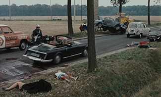 Godard a fait ce film pour « tout casser », c’est évident, mais c’est surtout sur nos chignoles qu’il s’est le plus déchaîné – notons qu’il a lui-même sacrifié sa propre Alfa Romeo décapotable à grands coups de masse dès le début du tournage ! La voiture que conduisait le Jean-Paul Belmondo d’A bout de souffle et de Pierrot le Fou était autrefois chez Godard un vecteur de liberté et d’indépendance, capable même de transpirer un certain « prestige créatif ». Dans Week-end, elle n’est plus que l’emblème d’une société mécanique et déréglée qui roule à l’aveugle en direction du mur, avec un conducteur devenu fou à partir du moment où il se retrouve avec un volant entre les mains. Liberté et apocalypse vont donc ici de pair, acquises toutes les deux à la jouissance de tout détruire dès lors que l’enjeu se limiter à posséder ce que l’Autre possède. Cyniques ou damnés, des animaux sociaux prennent à grande vitesse le virage serré de la monstruosité, et personne n’en réchappera vivant, dans le véhicule (qui finira brûlé ou broyé) comme sur le bord de la route (là où les cadavres pullulent). La couleur rouge revient donc en boucle tout au long de ce film cannibale : comme les hommes finissent par se dévorer entre eux, ce rouge sang qui suintait la « surexposition pop » dans Pierrot le Fou et La Chinoise devient ici autant un matériau social (le signe d’une civilisation bientôt éteinte qui laisse la place à un nouvel ordre primitif) qu’une présence organique suscitant le malaise. Le sang n’est plus destiné à circuler mais à gicler de toutes parts : lapin dépecé, cochon égorgé, oie décapitée, belle-mère assassinée, époux à la tête fracassée, sans oublier cet amas d’accidentés de la route qui jonchent ici un long et légendaire travelling latéral de trois cent mètres sur un embouteillage insensé – un sacré défi technique pour Godard. Presque un Apocalypse Now provincial qui serait arrivé près de chez vous et qui suinte le passage d’une ère barrée vers une autre. Bien plus que ces théories révolutionnaires et anticolonialistes énoncées par les opprimés de la terre au détour d’un long monologue, la profession de foi de tout ce bazar viendra ici d’un Balsamo ultra-siphonné : « J’annonce aux temps modernes la fin de l’art grammatical et le début du flamboyant ». Tout est dit : le monde et le cinéma godardien, d’abord en chaos, vont renaître chacun sous une forme plus radicale.