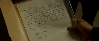 Le Zodiac, une « créature de cinéma » ? C’est en effet l’autre clé analytique du film. Certes, le 7ème Art, et plus précisément le système hollywoodien, aura fini par digérer cette figure criminelle insaisissable au travers du Dirty Harry de Don Siegel en 1971 (soit au moment précis où l’enquête se mettait soudain à piétiner), mais les prémices de l’investigation avaient déjà laissé filtrer un lien évident avec Les Chasses du comte Zaroff – le tueur chercherait-il à se constituer son « royaume de victimes » comme Zaroff chassait le gibier humain sur son île ? Certes, les indices que le serial-killer laisse aux médias et aux policiers sont de nature à brouiller les pistes – son symbole désigne-t-il un viseur, un logo de montre ou une amorce présente sur le countdown inaugural d’une bobine de film ? Certes, le récit va même jusqu’à balancer un nouveau suspect en la personne d’un vieux projectionniste de cinéma, au détour d’une scène très angoissante dans un sous-sol glauque. Mais si le Zodiac appartient moins à la réalité qu’à la fiction, c’est parce que sa réalité à lui n’est pas la même que celle de ceux qui le traquent. Les signes qu’il laisse derrière lui – en particulier ces fameuses lettres cryptées dont le sens reste sujet à caution – ne forment ainsi qu’un bricolage hasardeux, un amas de choses grappillées à droite et à gauche, pour ne pas dire des preuves circonstancielles que les armes les plus concrètes de toute investigation policière (balistique, graphologie, identification par empruntes, etc…) ne cessent de reléguer à l’état de preuves indirectes. Ainsi s’impose le Zodiac : coincé à jamais dans le hors-champ métaphysique, codé et crypté comme son langage. Et de ce fait, en tant qu’homme-orchestre conscient du vertigineux matériau théorique qu’il avait entre les mains, Fincher ne pouvait que faire meilleur écho à cette figure paradoxale en l’incarnant via une mise en scène elle-même cryptée par la texture éminemment trompeuse de la HD.