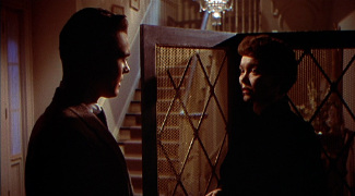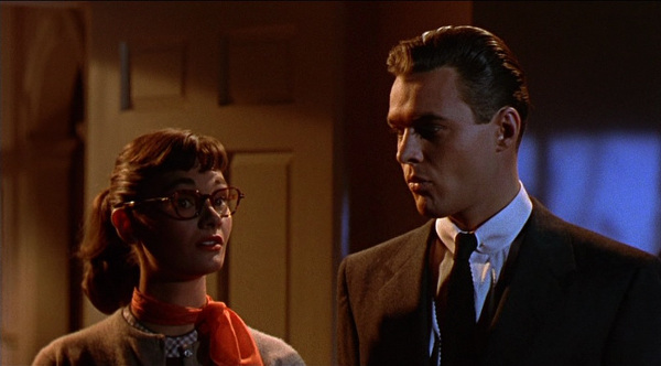 Plus « grave », plus mélodramatique encore : la surveillance sociale du personnage de Cary est également le fait de ses propre enfants. On retrouve ici la famille comme rempart le plus resserré enfermant le héros ou l’héroïne de mélodrame dans l’analyse du genre par Georg Seeßlen. Si l’on a déjà évoqué le fils aîné de Cary, Ned, jeune homme suffisant à l’héritage paternel visiblement machiste, la cadette Kay est l’un des personnages les plus intéressants du film en ce qu’elle révèle la profondeur avec laquelle les carcans sociaux limitent les actions des individus. Même une jeune femme se prétendant émancipée en vient à entraver, en un terrible chantage affectif, l’épanouissement de sa mère. Etudiante en philosophie, Kay serait censée être à même de s’affranchir des convenances sociales pesant sur les femmes. Un brin bravache, elle tacle le complexe d’OEdipe évident de son frère au début du film. Pour autant, cette apparente émancipation masque un conformisme trop profondément ancré. Cela est suggéré une fois de plus par le recours de Sirk à des motifs dont il faut se méfier du caractère éculé. Avec sa jupe sage et ses grosses lunettes, Kay est trop conforme à la caricature de l’intellectuelle colportée par le cinéma hollywoodien de l’époque. Sirk prolonge le cliché pour le signaler comme supercherie : tout ceci n’est qu’un déguisement.
