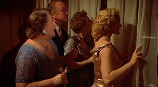 Dans la seconde, où Cary tente de présenter Ron à la communauté (cf. extrait ci-dessus), les sous-entendus sont plus virulents encore : ils prêtent de mauvaises intentions à Ron (il épouserait Cary pour son argent) ou à Cary (elle s’enticherait d’un tas de muscles habitué au travail en extérieur, « mais aussi en intérieur » lâche Mona, personnage présenté d’emblée comme médisant). Dans ces moments, la gêne (et non la colère) de Cary correspond à une forme de contenance dont il s’agira d’analyser le processus émotionnel, tandis que celle des convives, qui laisse parfois place à de la condamnation voire de l’offense, définit ceux-ci comme une masse jugeante. Un passage en revu des personnages secondaires résidant en ville révèle néanmoins des nuances à cet aspect de « masse » et rappelle la subtilité dans l’écriture des personnages qui faisait déjà la réputation de Sirk en Allemagne.